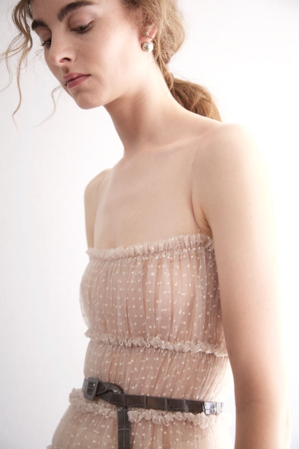 In keeping with the tradition of haute couture and of the house, Chiuri delivered a procession of ethereal evening wear in delicate chiffon and tulle. Ebullient surfaces were seen throughout from voluminous yet weightless ruffled gowns to densely intricate floral detailing embroidered onto featherweight chiffon dresses.