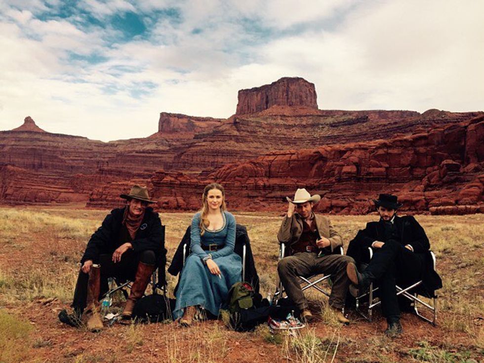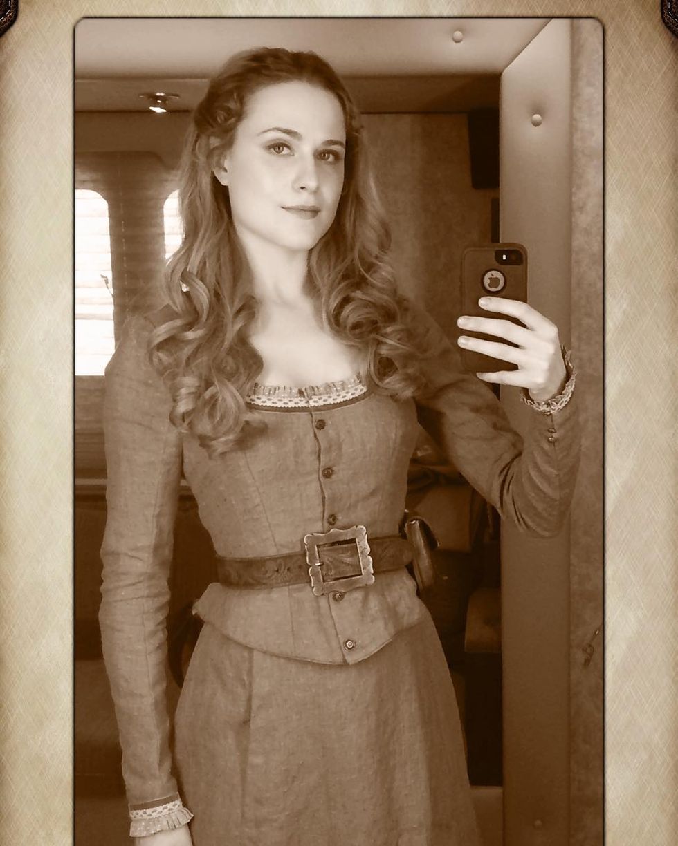 It wasn’t until we noticed one detail that our jaws dropped: the way Evan’s cropped jacket paired with her long, wide-leg pants reminded us of her Westworld costume—aka the blue, button-up skirt set that Dolores Abernathy wears in every episode. Perhaps she wore it as a token of good luck, since the show was tied with SNL for most Emmy nominations? Or is she just *that* excited for season two, which is set to return in 2018 (in which case, same)? Take a closer look at the actress’ outfit ahead, then compare it to the one she wears on-screen.