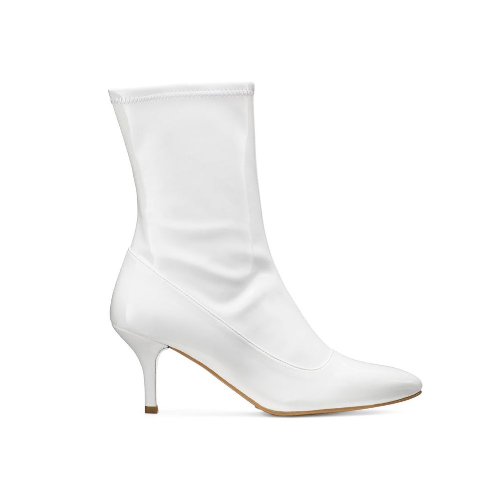 Fire-engine red thigh-high boots aren’t for the faint of heart. Neither is a mini-skirt suit, but the jacket’s almost-deconstructed silhouette keeps the look in check, without feeling too revealing. A snow-white pair of sleek, pointy ankle boots (like Stuart Weitzman’s classic Clinger shape) are the single coolest item you can add to your wardrobe this season.