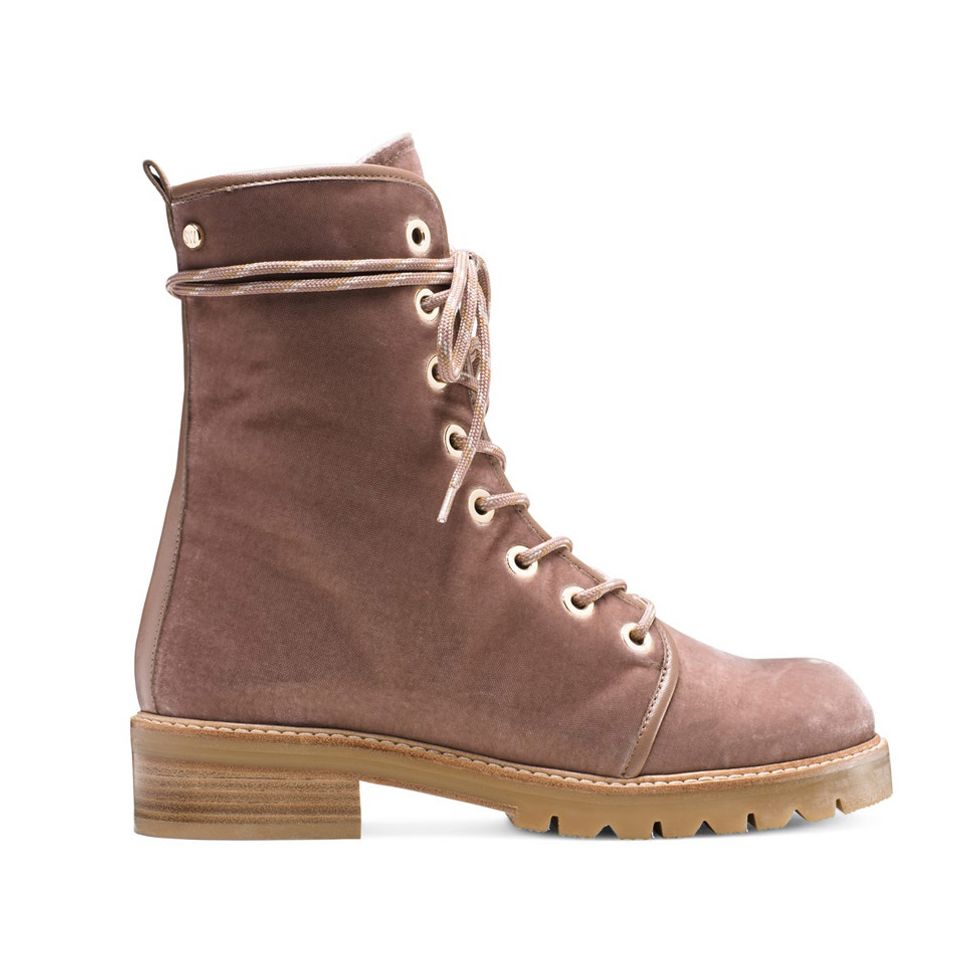 Velvety dusty-pink work boots might just be the most unexpected item on your list of must-haves for fall. A silky blazer dress in a bubblegum hue and burnt red faux fur coat over top add a much-needed hit of texture without seeming like you tried too hard. Patent black combat boots require equal parts polish and cool to pull them off. A slinky, midnight blue velvet slip dress and off-the-shoulder denim jacket achieve just that.