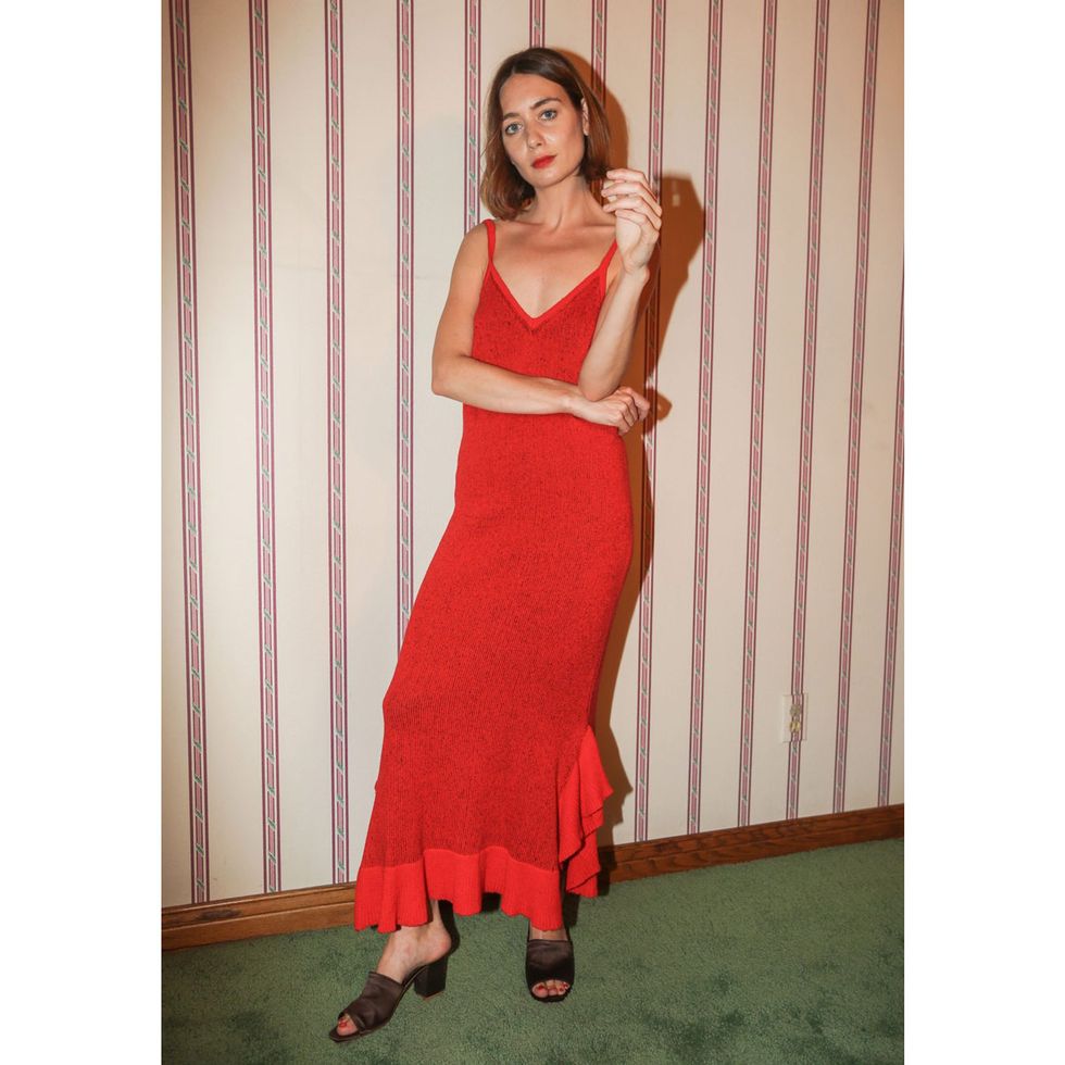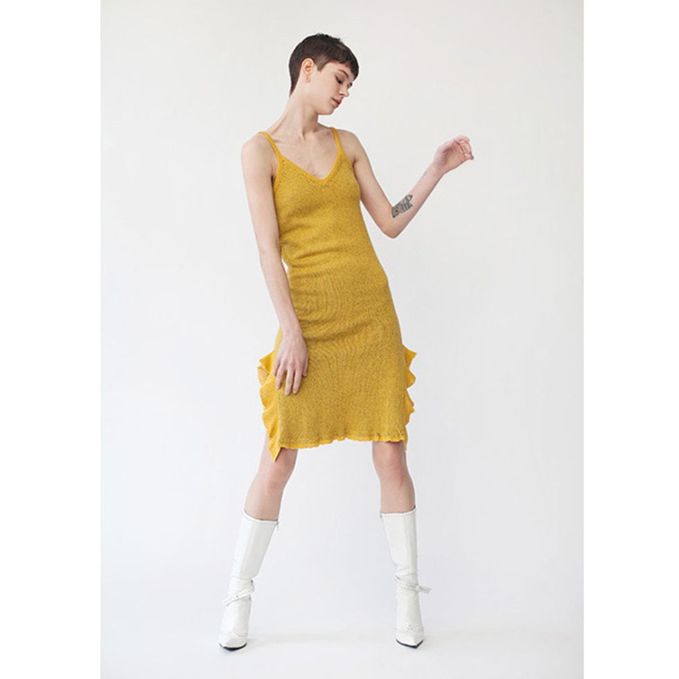 Maria Dora’s knitwear landed a starring role in a film on a whim. The L.A.-based designer ran into Trish Summerville—who has designed costumes for Gone Girl and Westworld—at a party, where they discussed Dora’s weaving and macramé work. Soon after she received a call from Summerville, who was working on The Hunger Games. Summerville needed some knit pieces for Katniss Everdeen, the role that would make Jennifer Lawrence a household name and the highest-grossing action heroine of all time. She wanted Dora to make the sweaters she wore. “I was too embarrassed at the time to tell her my knitting skills were elementary, so I just agreed to it,” Dora says laughing.