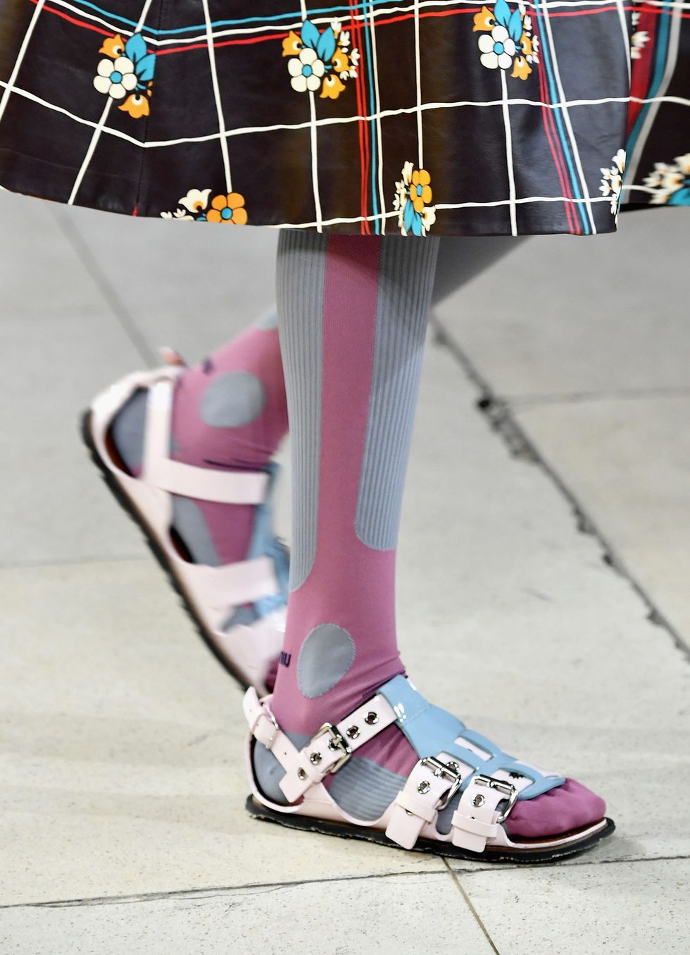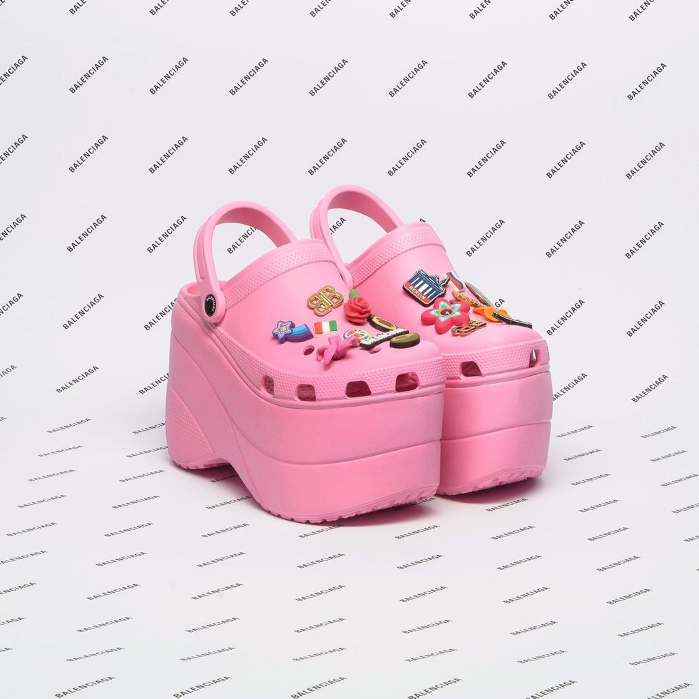 elevated models with platform Crocs adorned with Balenciaga pins. Stella McCartney paired eveningwear with cycling sunglasses commonly seen on tourists and lax bros. Off-White paid tribute to Princess Diana’s love of biker shorts. Other fashion faux pas that walked the runway included socks with sandals, popped collars, sweater-vests, and waterproof ponchos.