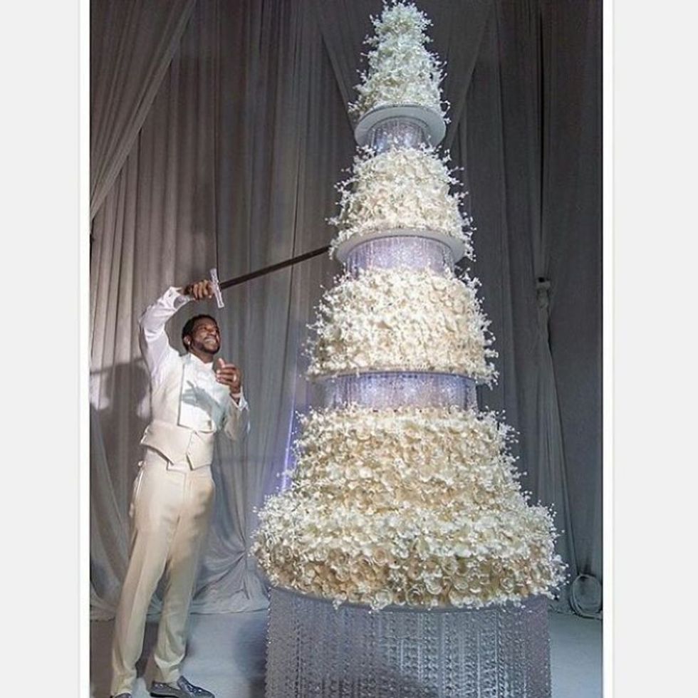His-&-hers Bentley wedding gifts, a 12-foot wedding cake (cut with a saber), an all-white dress code, and a diamond-encrusted bouquet.