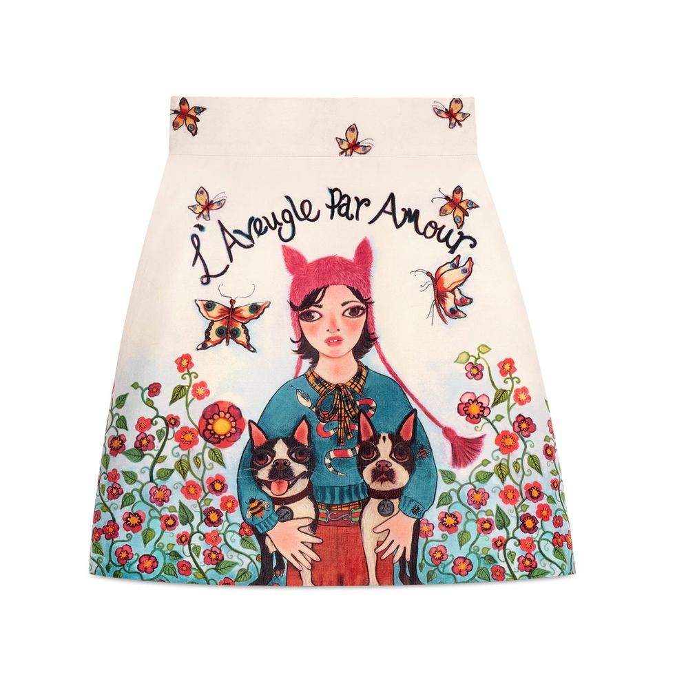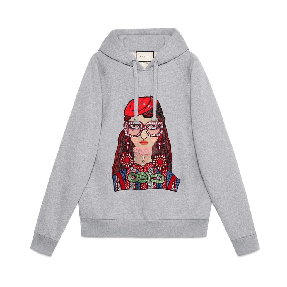 Her favorite pieces from the Gucci x Unskilled Worker capsule collection: “The embroidered jeans are really nice—they really were killing it with the embroidery. I think Gucci was the first brand to do that correctly. I also like the skirt. All of the paintings that Gucci chose, they make you feel an emotion. They stick with you in your mind. And that hoodie is definitely super-fire. They put the square, classic Gucci frames on the paintings—that’s the ultimate definition of a perfect collaboration.”