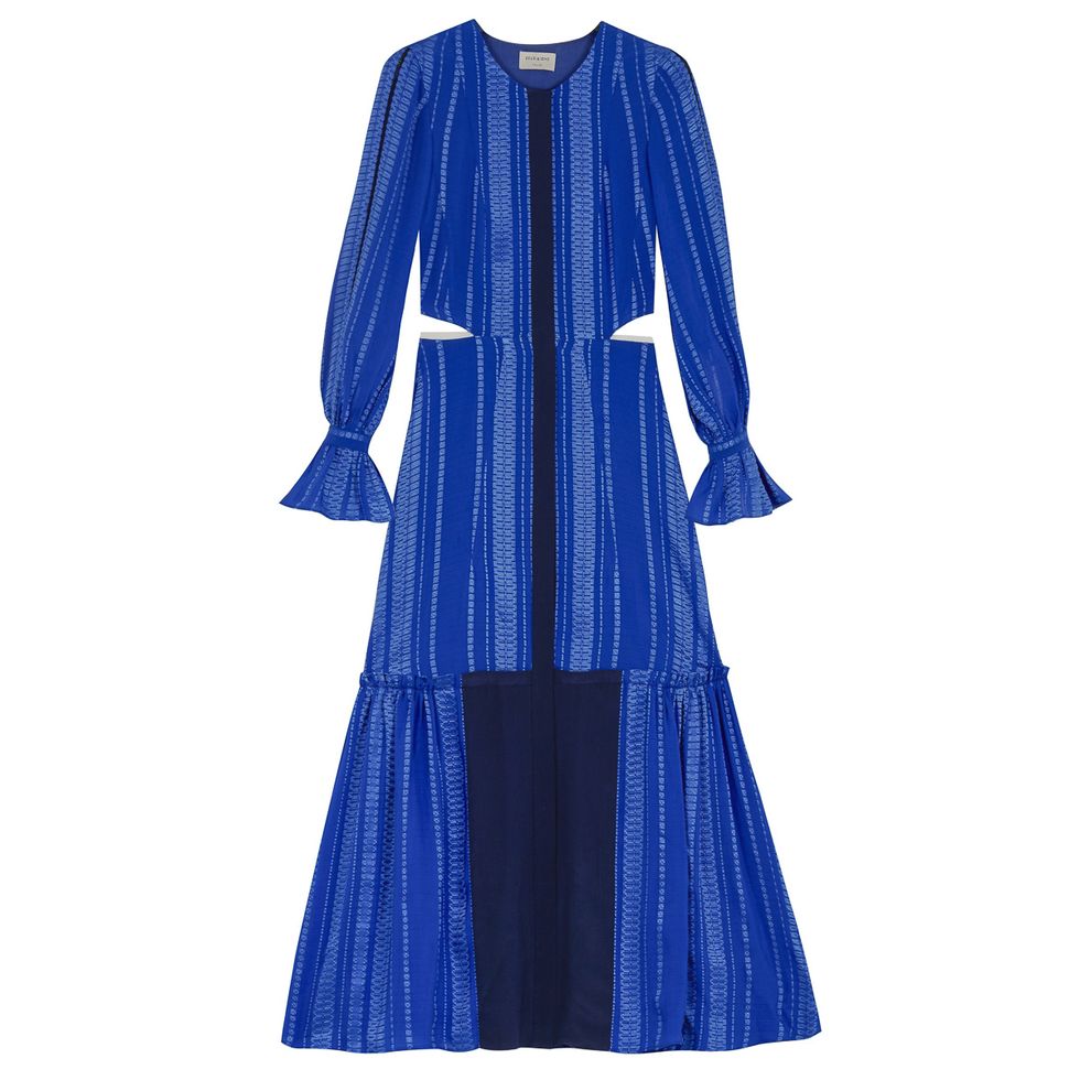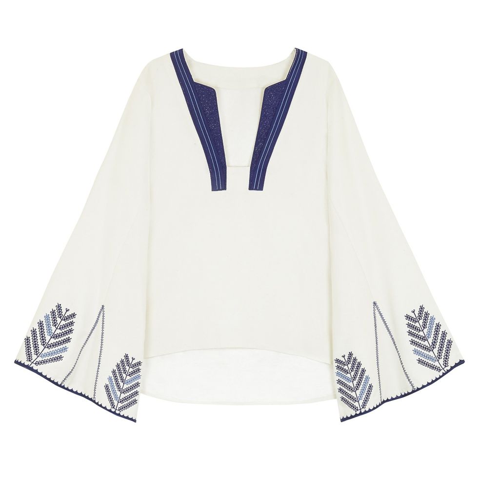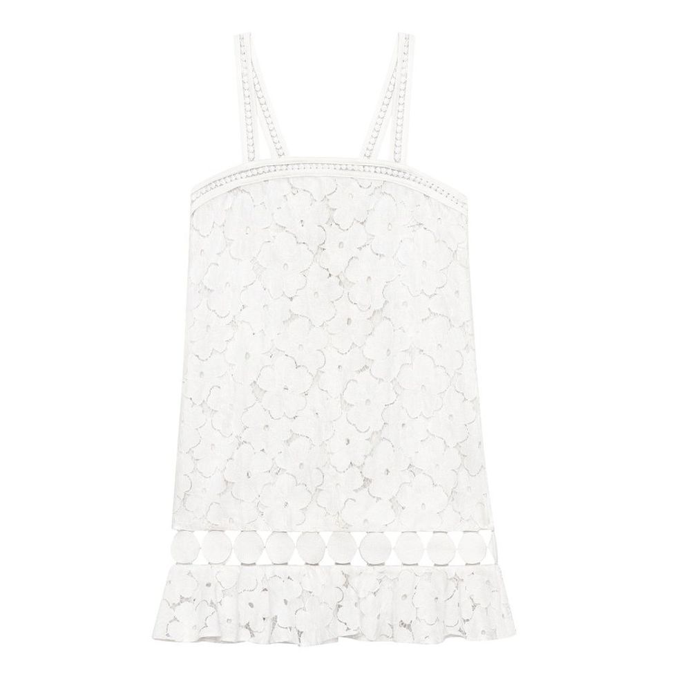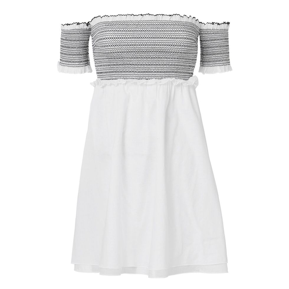“The Adi is the perfect beach cover-up—I love the back tie detail. I adore the Aya off-shoulder white tunic with our signature contrasting black smocking. It is both playful and romantic, the perfect piece to transition from beach to daytime on a warm-weather getaway! Mila in black and blue is our newest bikini [and] is very clean, modern, and versatile. Our smocking iteration on the flattering off-shoulder silhouette. Bella in white and pink is our classic triangle bikini [and] in our pop pink [it] is a classic staple. And of course I always have some cute going-out dresses and my Gianvanito Rossi Portifino strappies!”