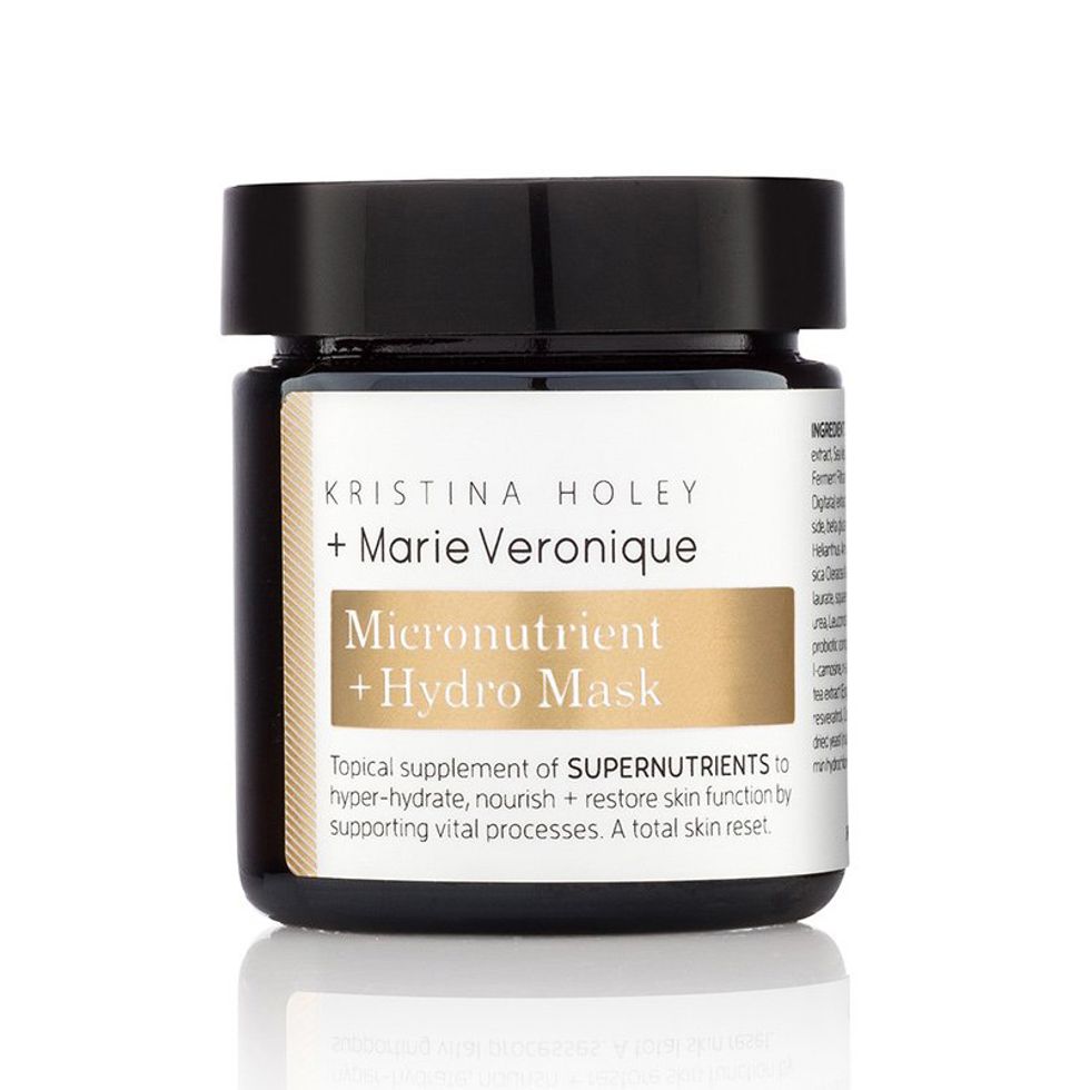 1. Kristina Holey + Marie Veronique Micronutrient + Hydro Mask: After exfoliating—a key pre-step before you use a hydrating mask, so you can be sure it really penetrates—I apply this mask and just let it sit for an hour, even overnight. It’s all-natural, but very high-tech, too. For example, it contains sodium PCA, which is a powerful humectant (meaning it attracts water to the skin). This whole line is amazing.