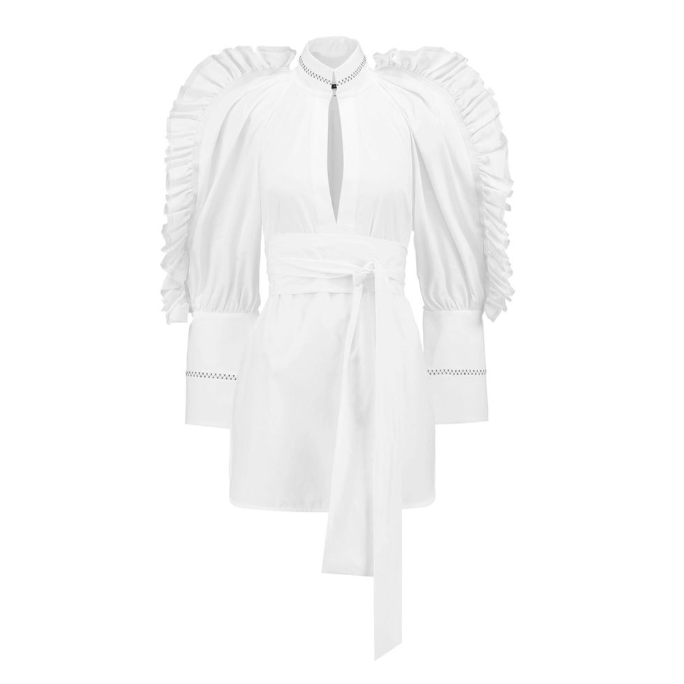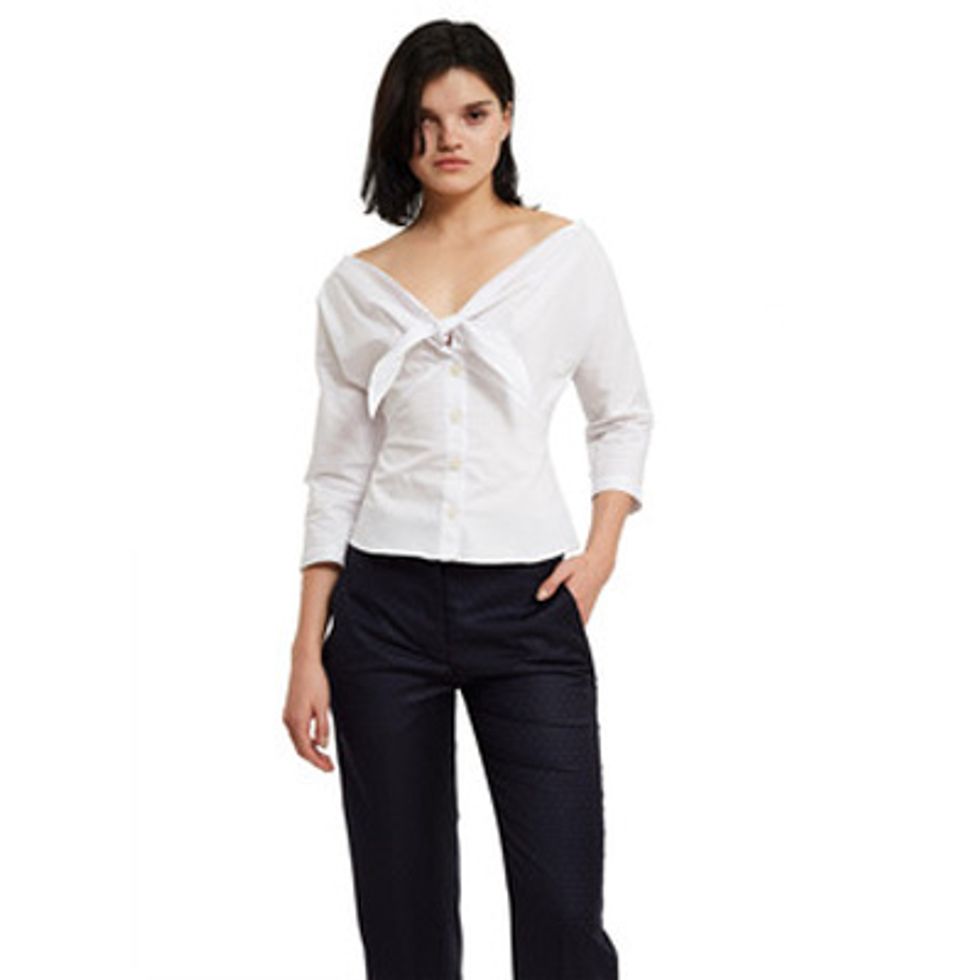 White button-ups don’t get nearly the credit they deserve. This is probably due to the fact that they are frequently paired with boring suits on Wall Street. But there is so much potential in them when they’re designed with a little extra fluff, ruffle, or a statement sleeve. If, however, you don’t want to experiment too much with the silhouette, do like Wu, and pair one with that crazy patterned skirt in your closet that doesn’t go with anything.