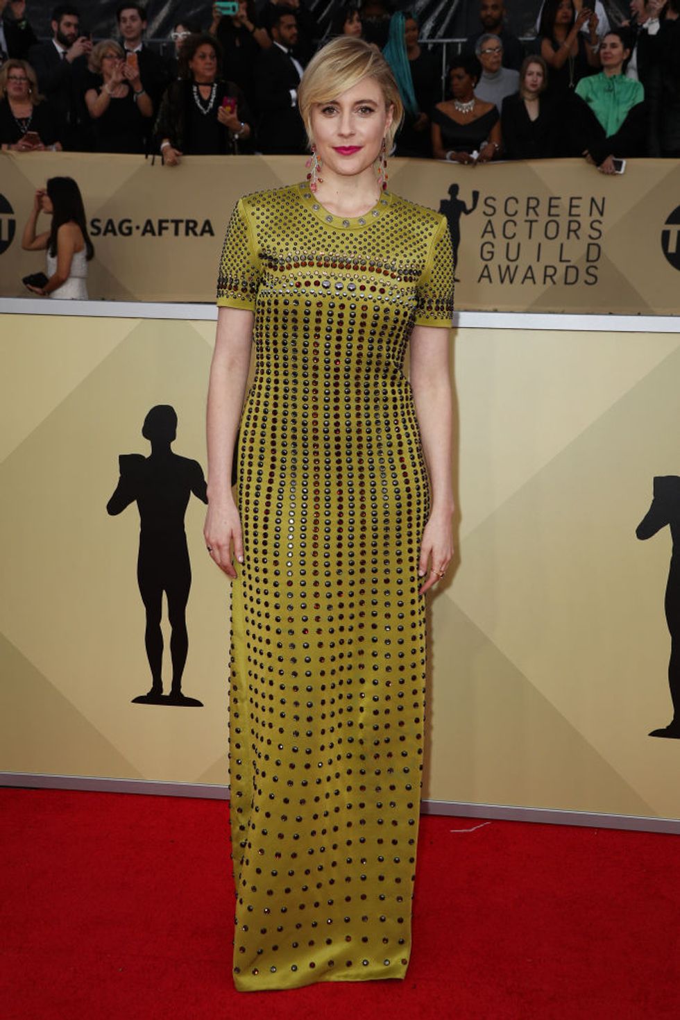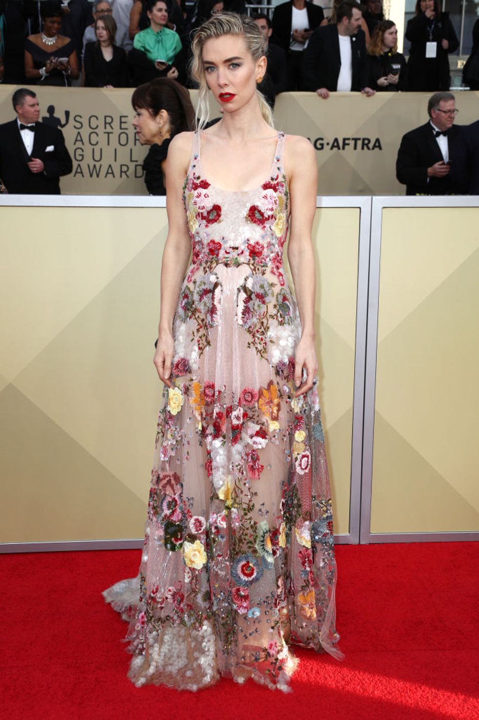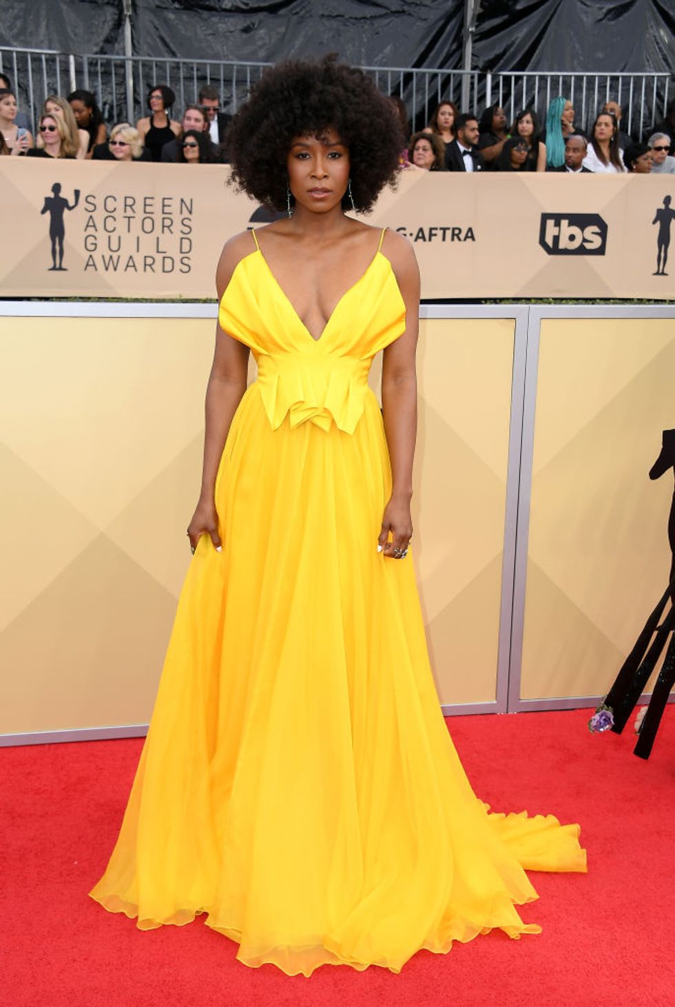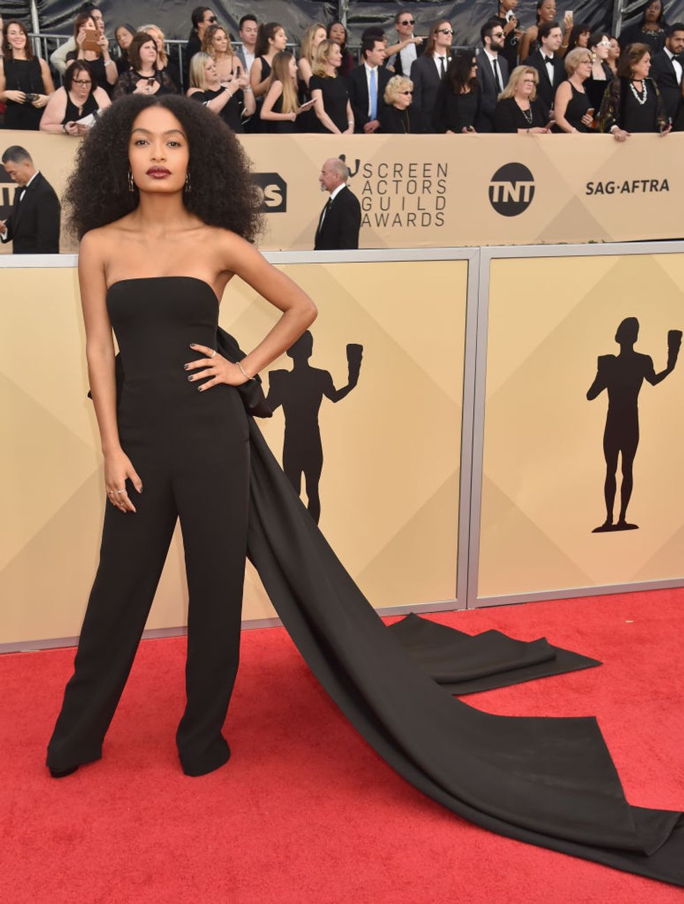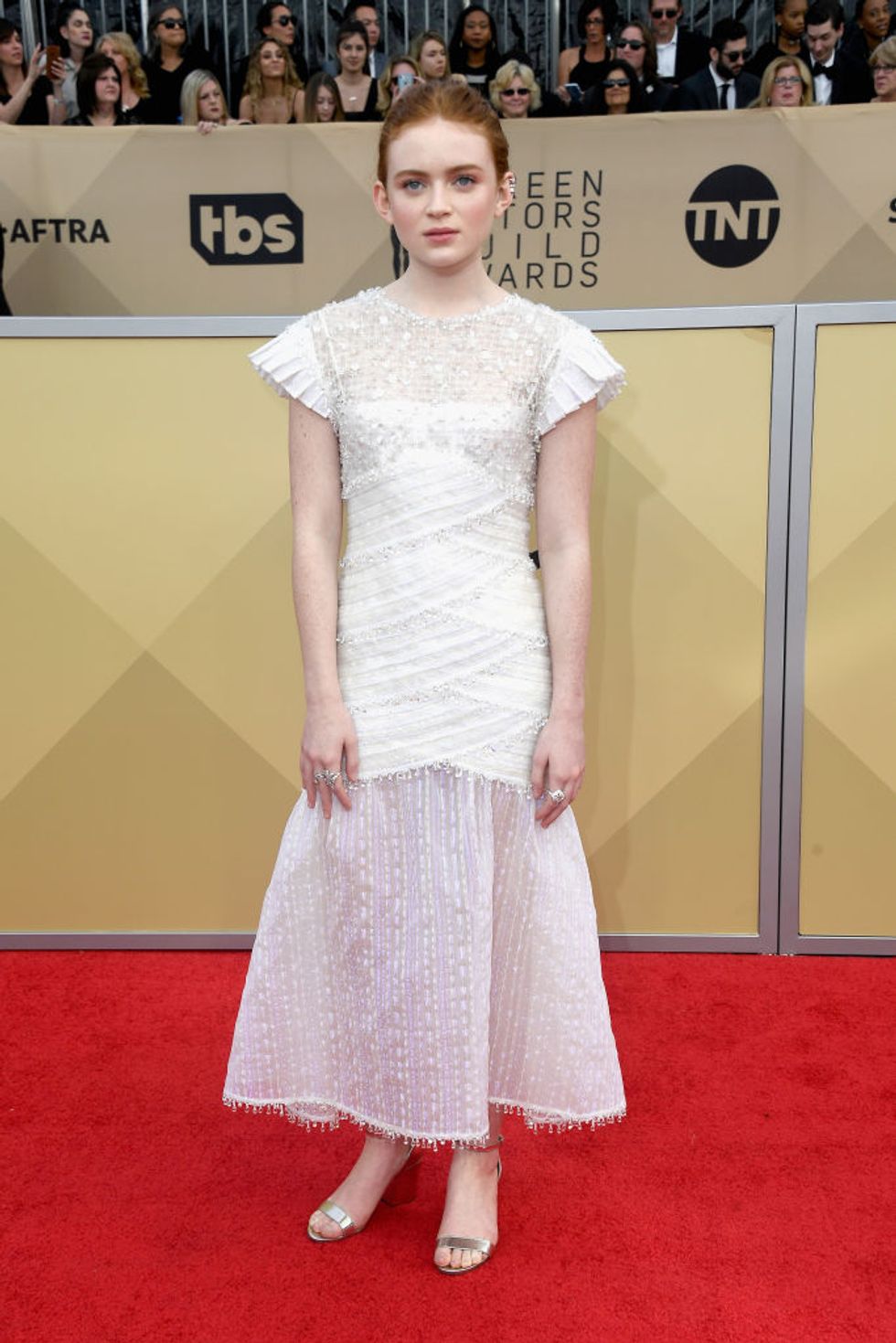 The 24th Annual Screen Actors Guild Awards aired on Sunday night, with celebrities from Natalia Dyer and Millie Bobby Brown to Tracee Ellis Ross and Allison Williams turning out for the festivities. While the the blackout fashion at the Golden Globes two weeks ago called attention to the Time’s Up movement, both the Critic’s Choice Awards and SAG Awards appear to have returned to the traditional glitz and glamour of the red carpet. Stars favored looks in white, cream, and pink shades, with plenty of sparkle and embellishment all around.