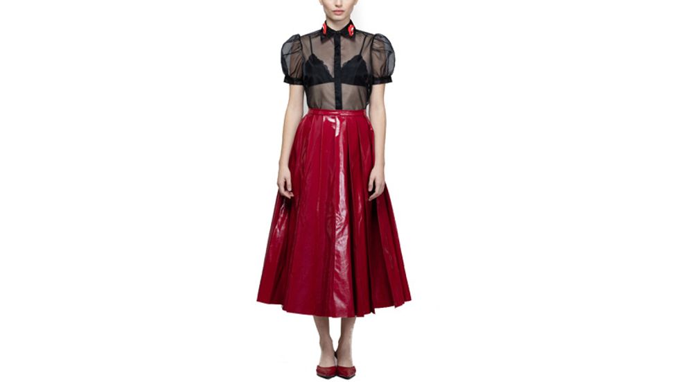 “My favorite part about this top is the beaded lips on the collar. I recommend wearing a slimming pant or a flouncy floral circle skirt. Evan Rachel Wood wore hers under a striped suit with the collar peeking out for a little pop.”