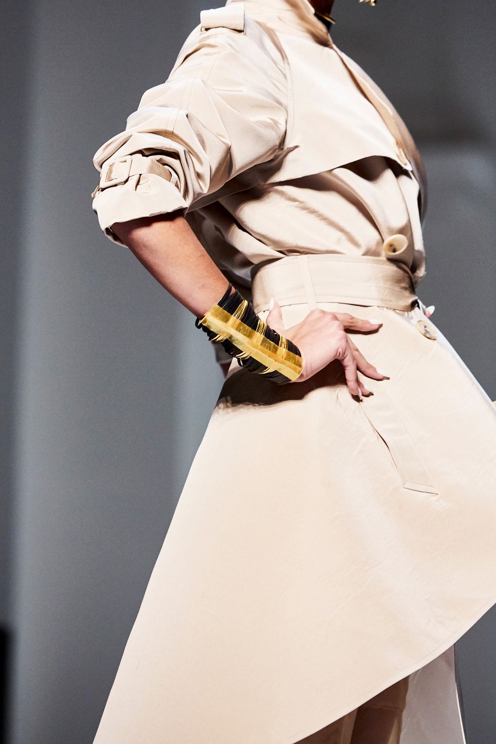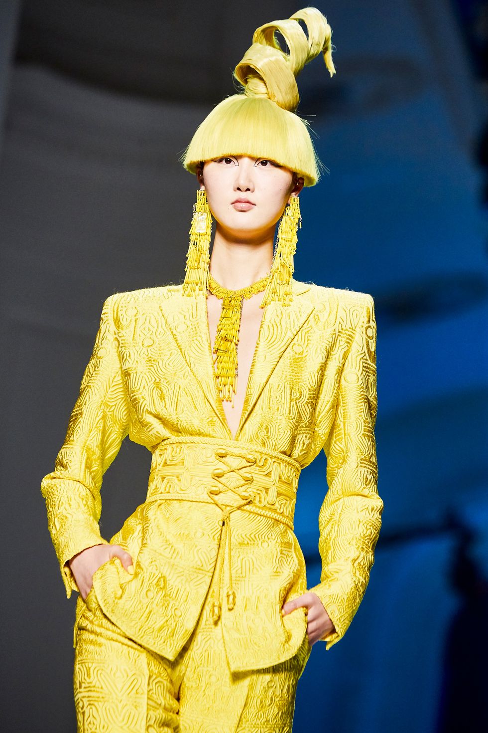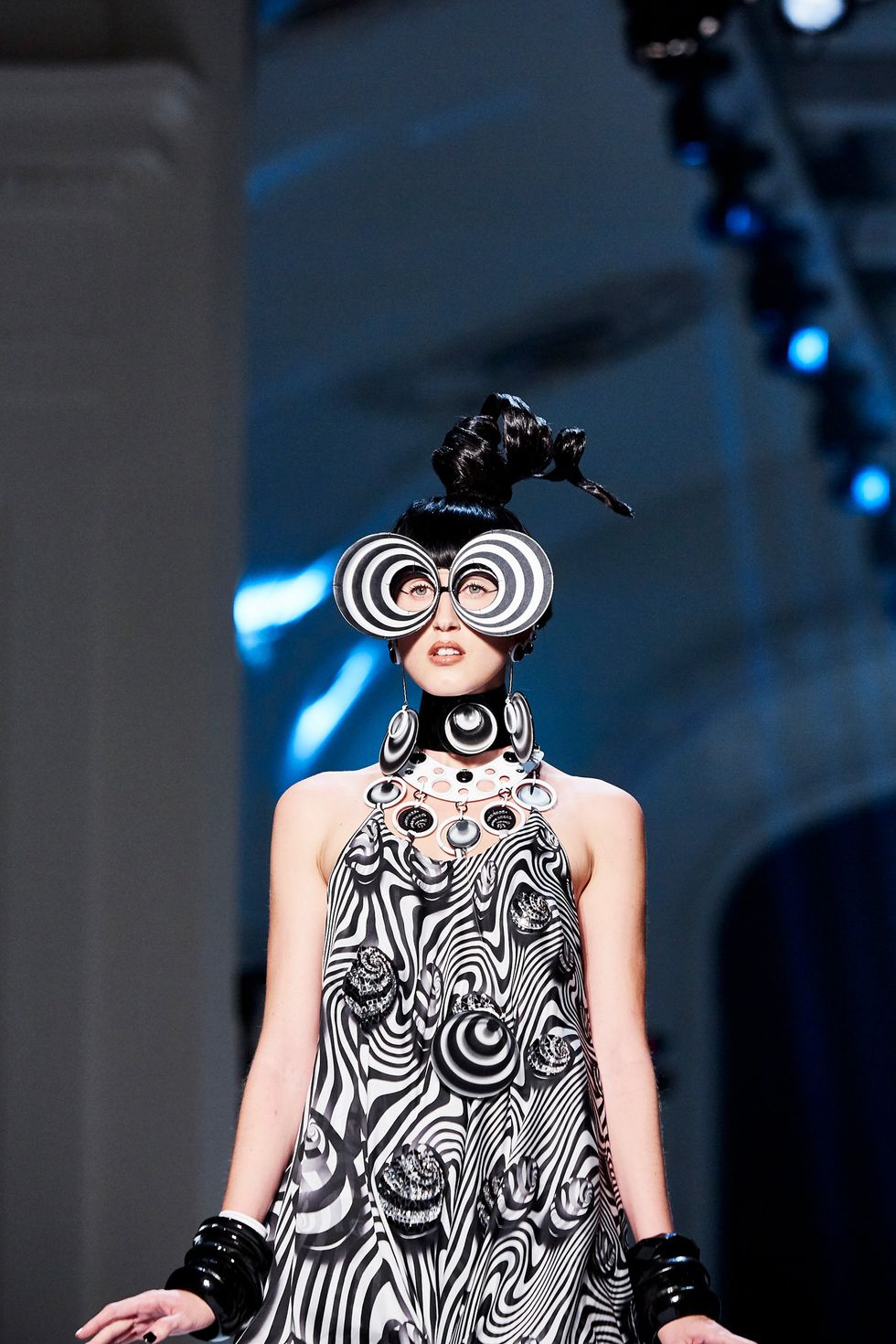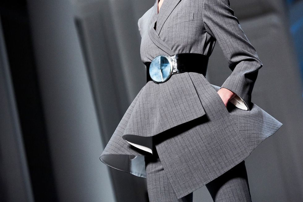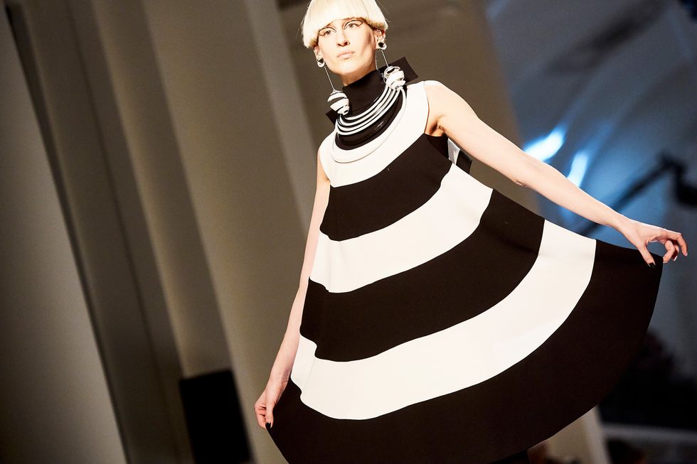 References to Op Art opened the show with monochrome tunics and suits with contrasting fins. Tailoring, of course, took center stage. Trench coats were re-worked with a Judy Jetson-esque twist, while dresses ranged long and fluid to one that looked like a piece of ribbon wrapped around the model’s body. Day Glo dresses and suits were paired with matching wigs, and prints were wild and bold.