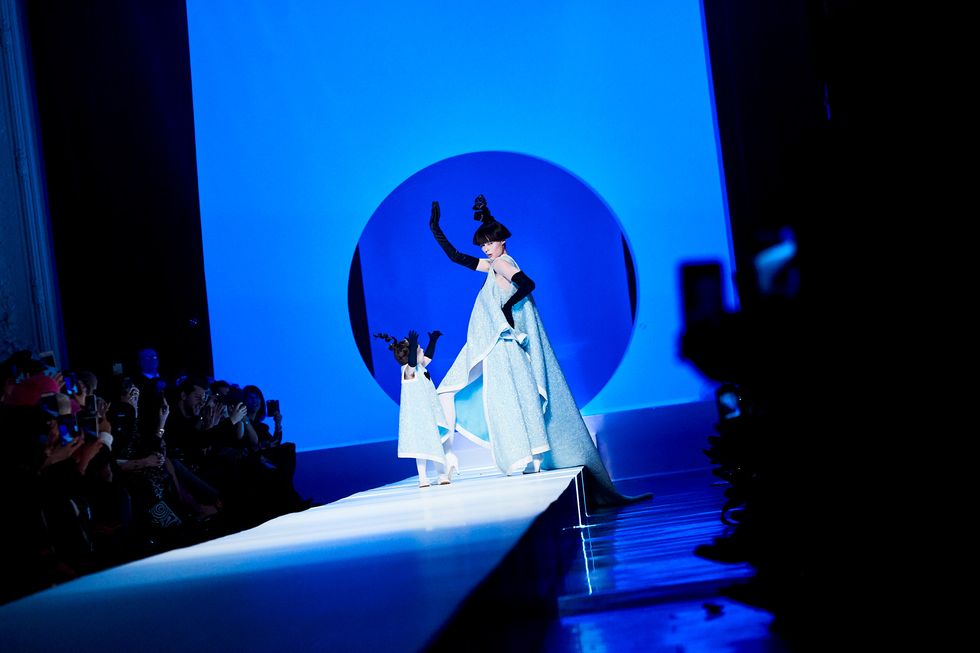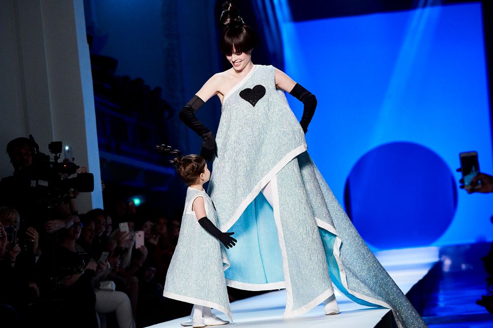 Coco Rochas, who is a veteran of the Gaultier runway, modeled one of the final looks with her daughter, Ioni, in matching ice blue dresses. The adorable two-year-old copied her mother’s poses as they walked down the catwalk hand in hand.