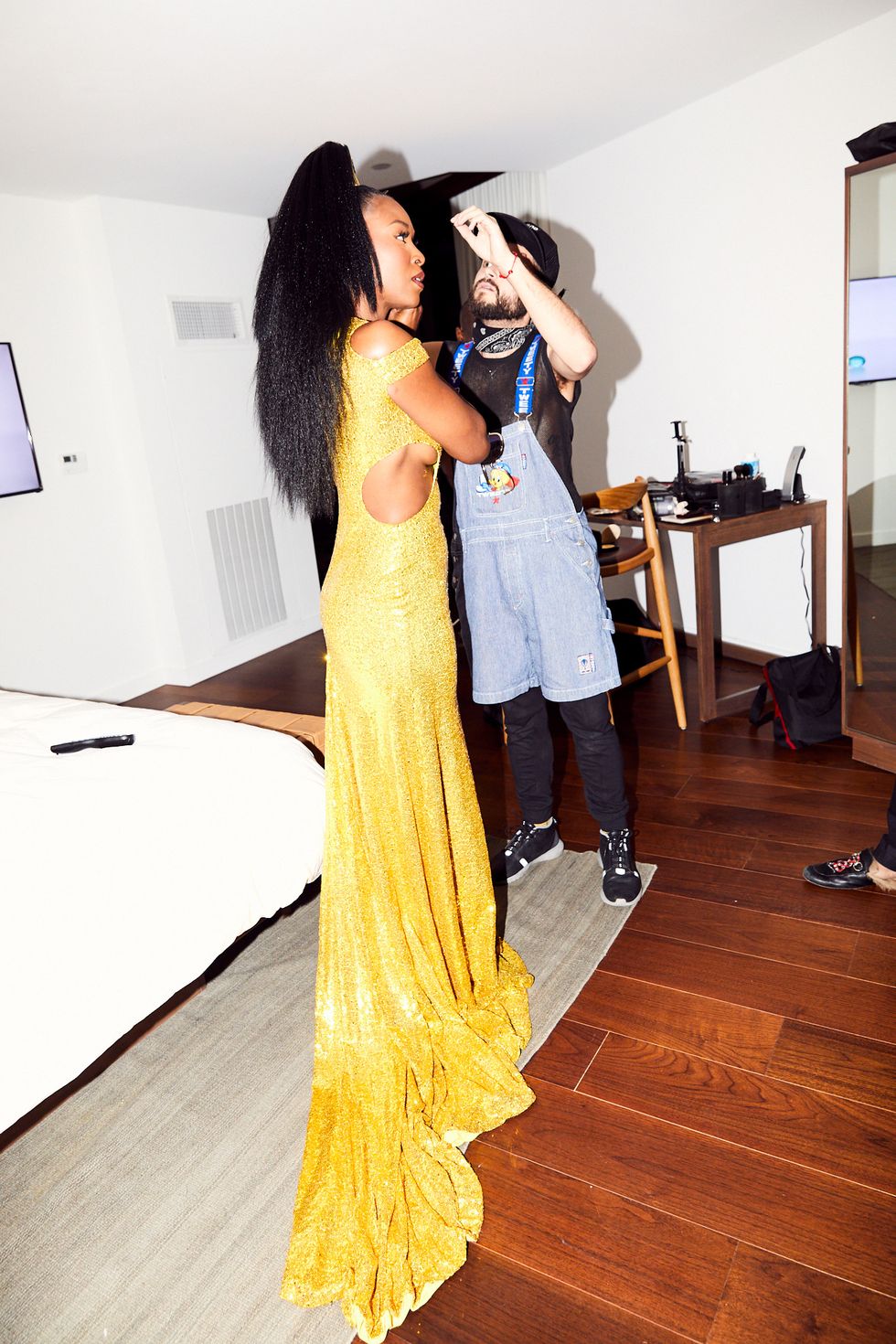 Naturally, we wanted to get in on the frenzy and celebrations, and so around 5:00 PM yesterday evening, we pulled up to The Jeremy West Hollywood Hotel and practically ran with excitement up to the room where none other than Sydelle Noel herself was getting ready for the big night, with the help of one of our faves, stylist and image architect Law Roach. While it was the first time they had worked together, you never would have guessed it; the two got along like old friends, and we happily watched from the sidelines, snapping photos of the process as Noel had her makeup and hair done and finally put on her beautiful gold gown that made her look like an actual queen. Roach could not have done a better job at pulling the perfect dress, and before Noel got swept off to the red carpet, we chatted with them both about the movie, how they ended up working together, and what it was like for Noel to audition for the role.