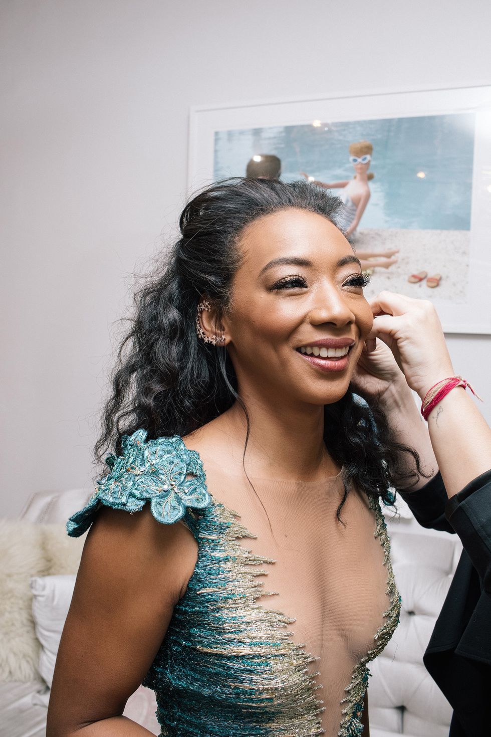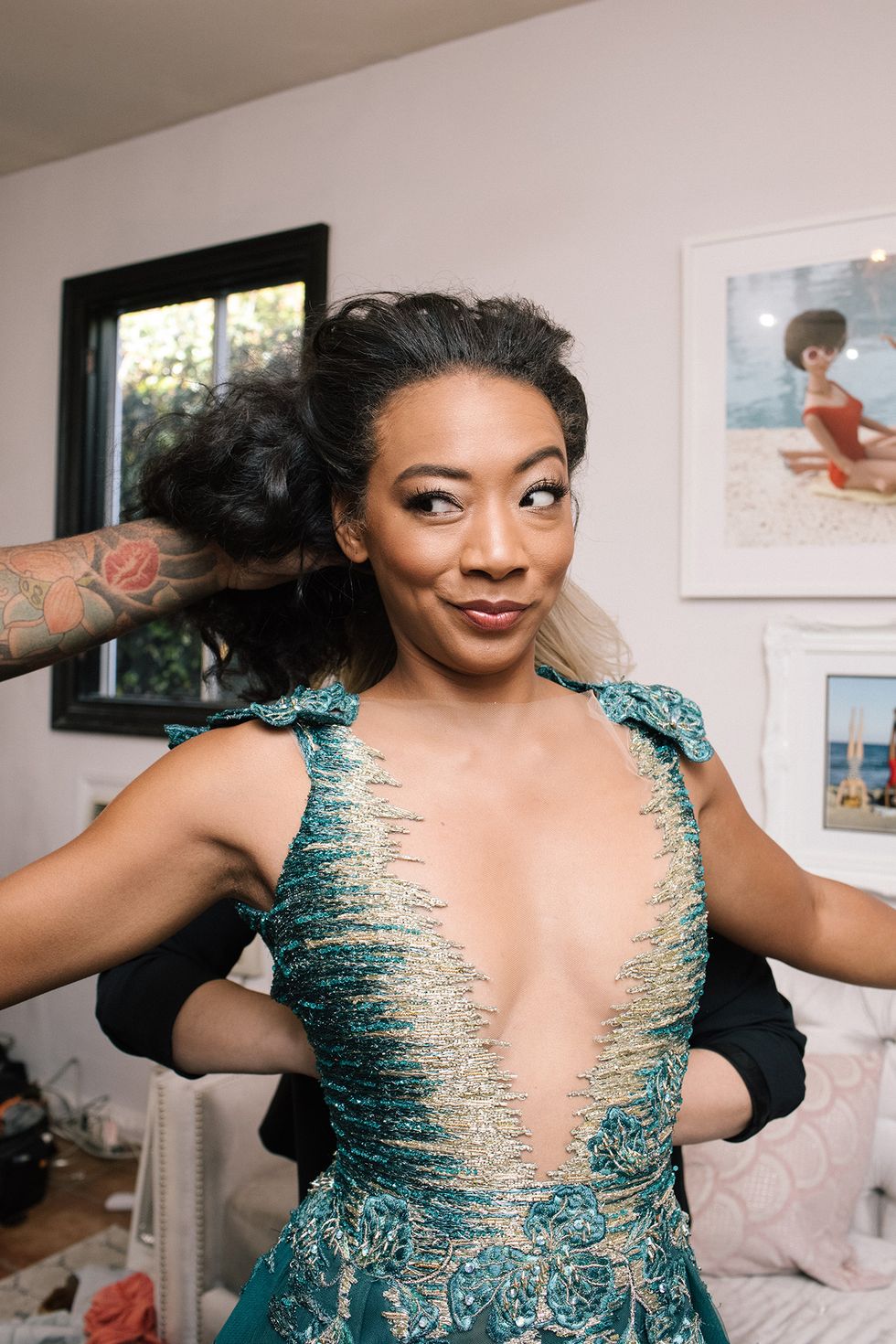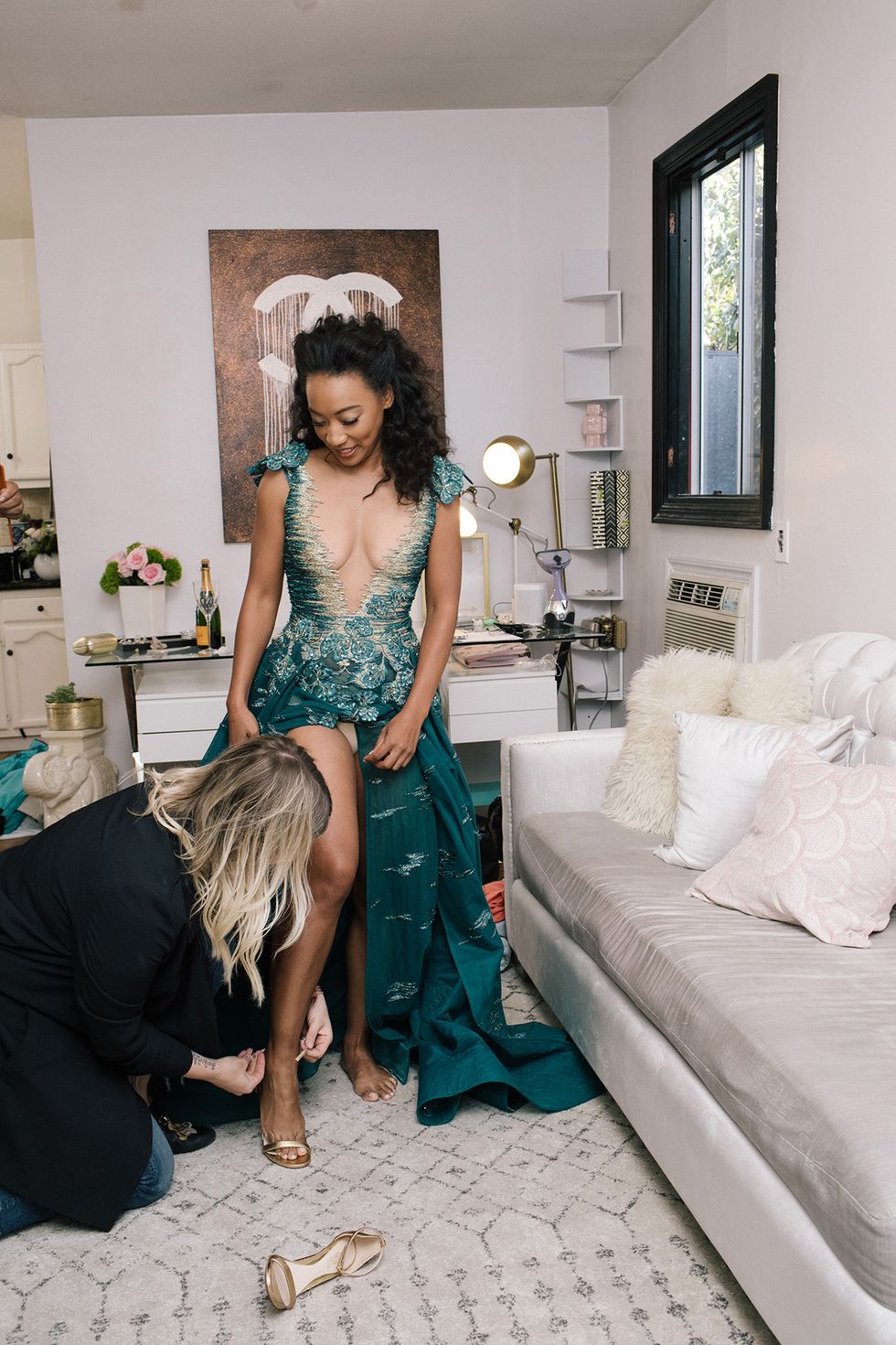 When Get Out’s Betty Gabriel stepped onto the Oscars red carpet, we have no doubt that jaws around the world dropped (ours certainly did). That plunging neckline! Those floral decals! Her hair! Her makeup! Her confidence! The sexy-meets-regal look was quite the contrast from the the maid we saw on screen in the history-making movie, and luckily we had the chance to see how it all came together. Ahead of the show, Gabriel had us over as she got ready and, along with her stylist Sonia Young, answered a few fashion- and film-related questions we had on our minds.