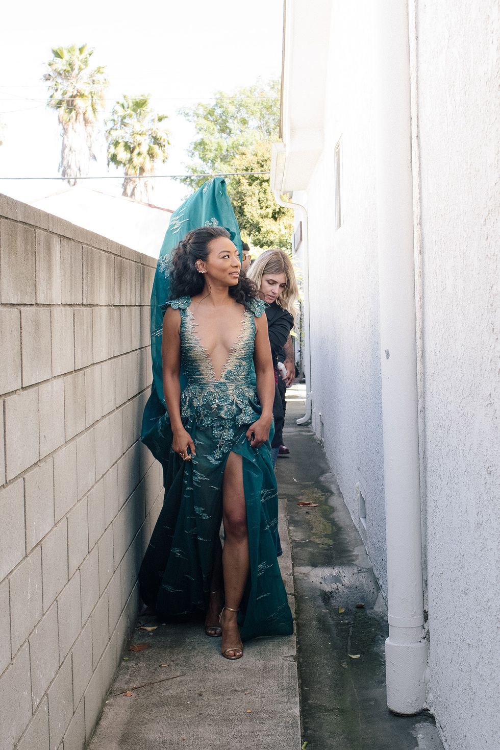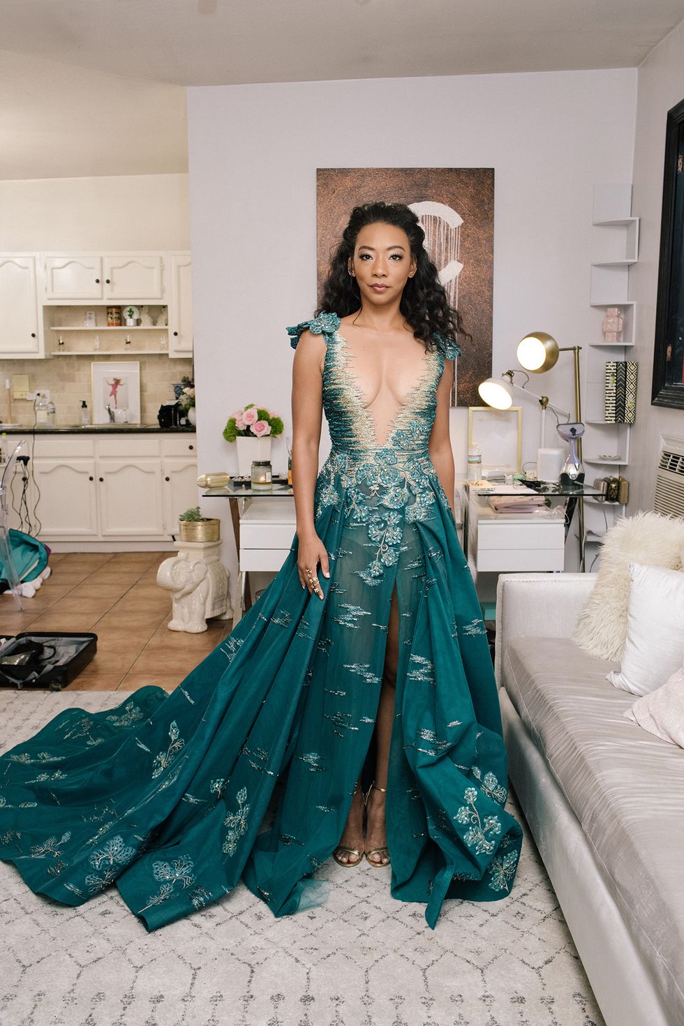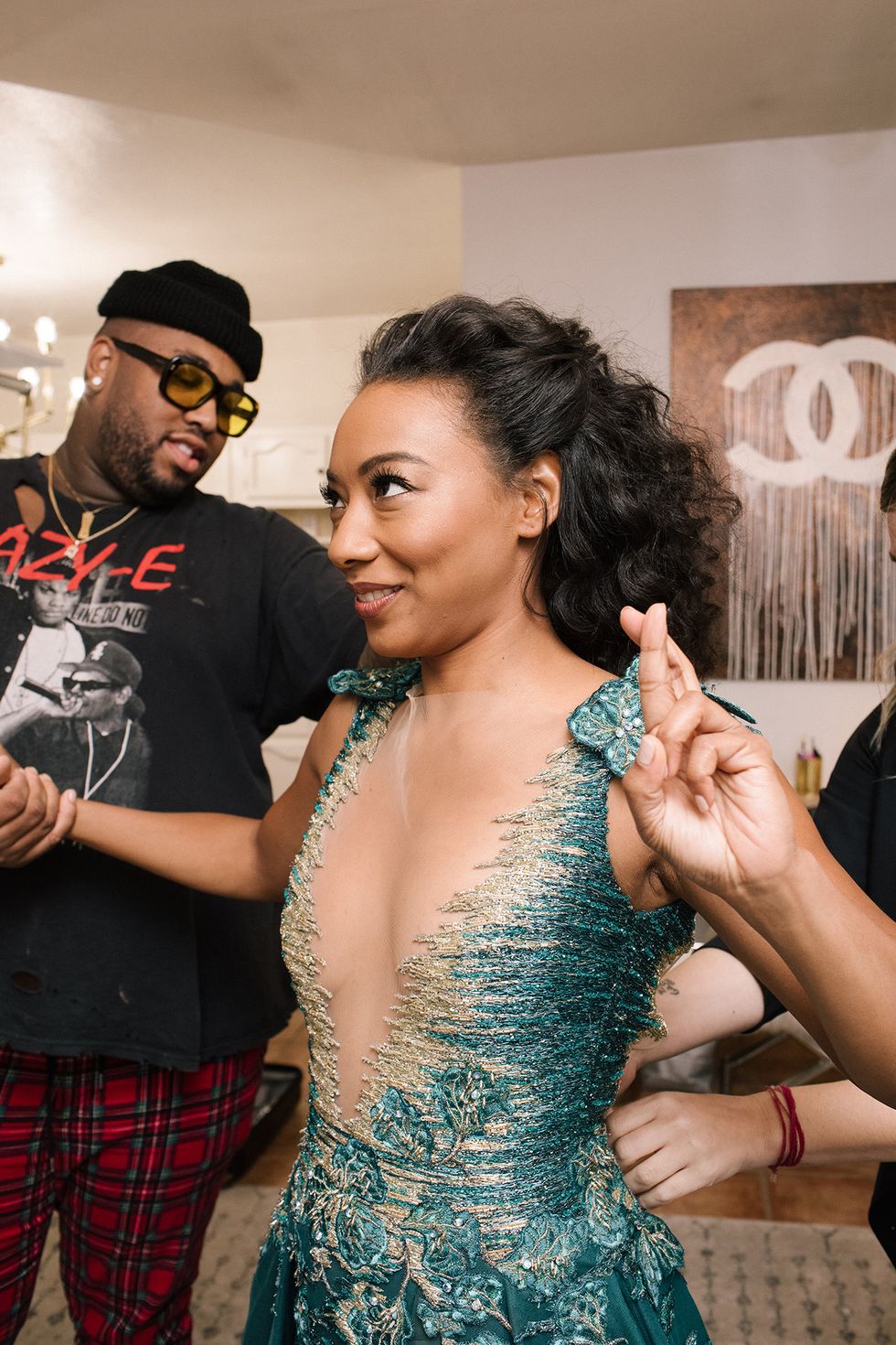 We got up close and personal with Betty Gabriel’s plunging, floral look as she got ready for the awards show.