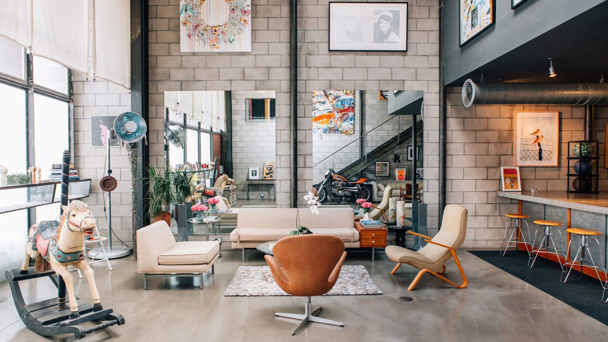 “As soon as I walked in I was blown away,” Perreira says. “I love the high ceilings, I love the skylight, and there’s a disco ball in the living room.” Perreira and her husband, Fred Manheim, moved into the home in 2008 and proceeded to fill it with vintage furniture, modern art, and whimsical touches like Perreira’s collection of Hello Kitty merchandise.