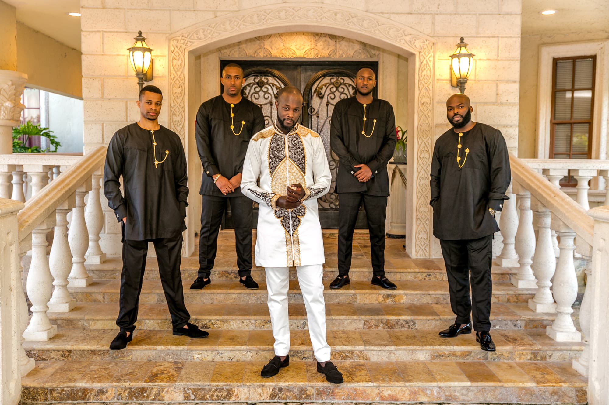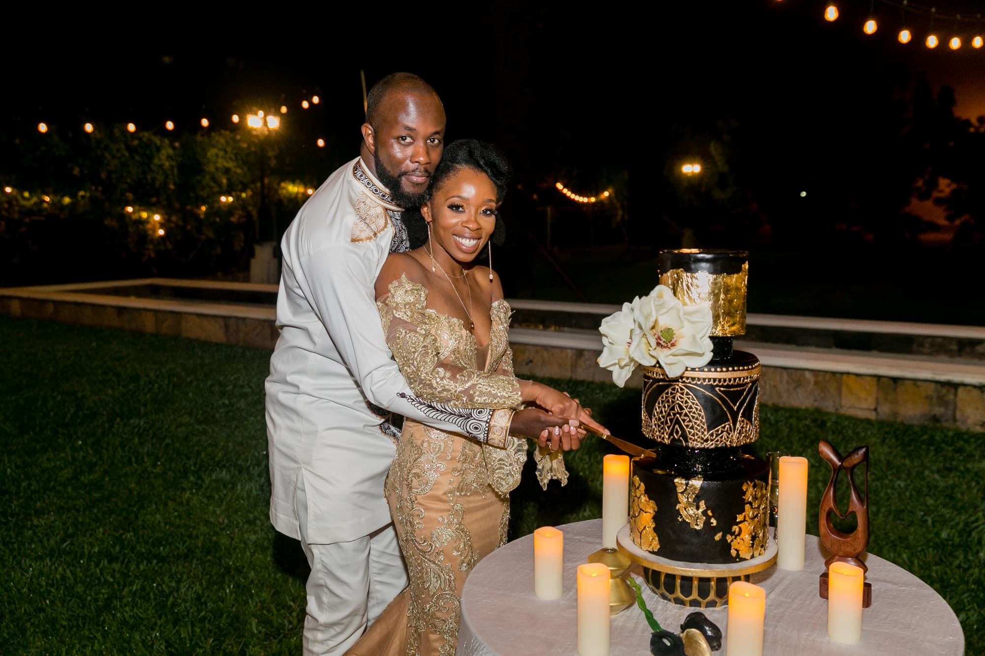 “The His & Her drink menu consisted of Rum Punch & Kenyan Dawa. I had about three dozen sculptures from one of our trips to Ghana and used them as decor on the tables along with calla lilies, gold eucalyptus plants, and black hydrangeas.”