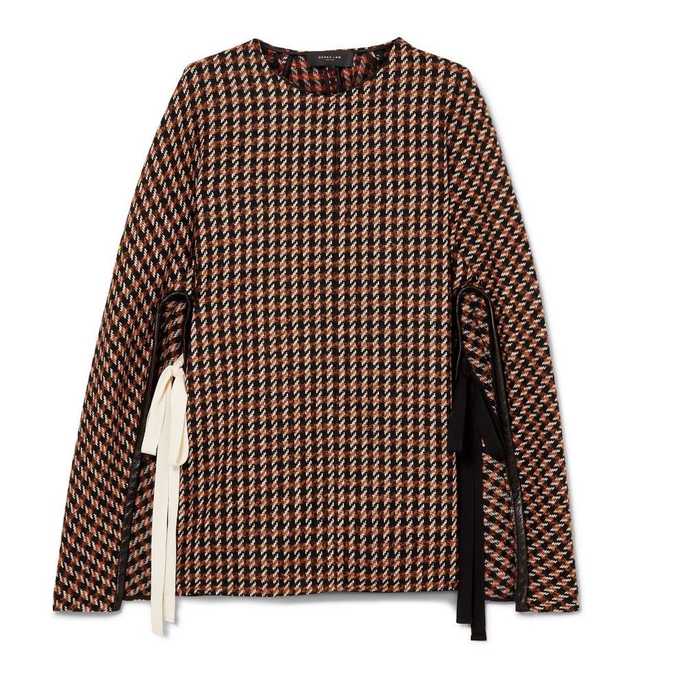 3. Derek Lam Leather-Trimmed Checked Wool-Blend Tweed Poncho: I live for fall days that aren’t cold enough for a coat, but still require an extra layer. I’m currently eyeing this poncho, which is painfully chic and would look great over a bodysuit or a turtleneck sweater.
