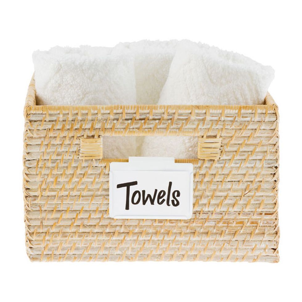 My clothes, dress heels, lingerie drawers, purses, and linens live in the clothing closet. I have long shelves in the closet where casual and athleisure clothes sit in folded stacks. The size of the fold is key because it determines how many stacks you can fit across each shelf. (You can see Jamie’s folding video here.) My coats, everyday shoes, and suitcases live in the front closet, with hats, scarves, tote bags, and my extensive collection of makeup bags (I love them all!) nestled into their own baskets above.