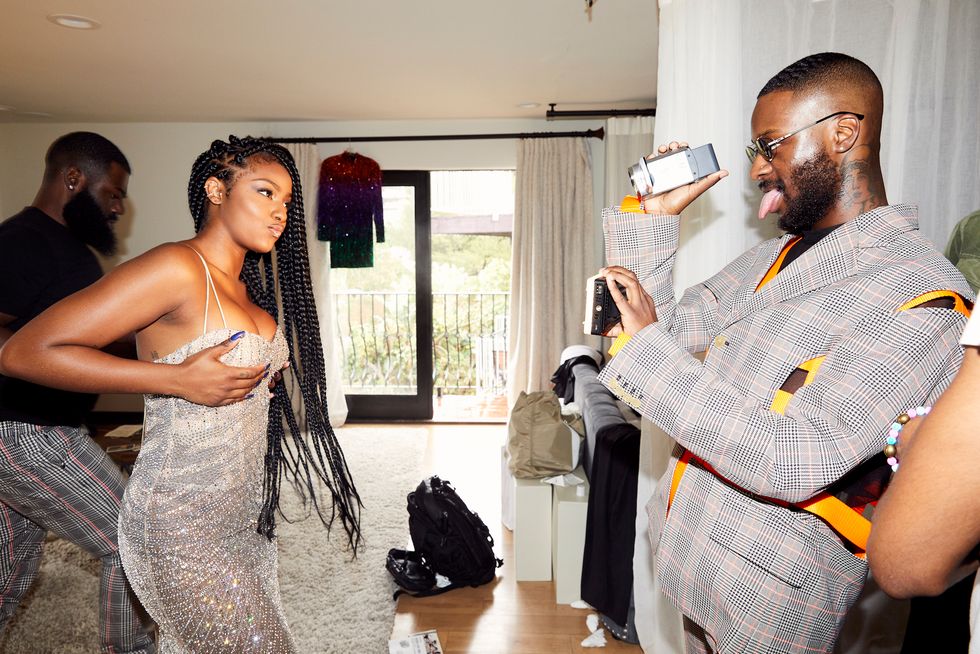 When we walked into the living room where GoldLink and Justine Skye were set to get primped and prepped for the 61st Grammy Awards, you would never have guessed that the two were hitting the red carpet in a few short hours. They were hanging on the couch, chatting with friends as the Lakers game played in the background, without a hint of nerves in the air. To be honest, it was a pretty ideal Sunday setup. But within 30 minutes, the two artists, accompanied by their mini entourages, had dispersed throughout the home, Skye getting glam done on one side, while GoldLink narrowed down his outfit choices (he had 10 in total—we counted) on the other.