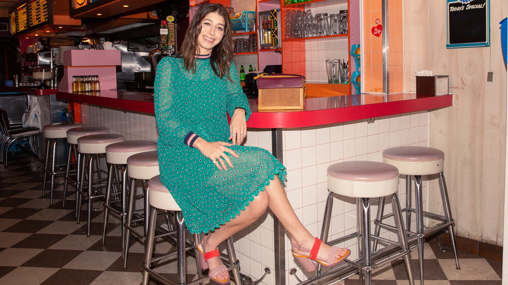 You can’t help but feel happy the second you set foot inside this Jamaican-themed restaurant. There’s reggae music blasting, and the decor will transport you to a tropical oasis—and who doesn’t want that? To kick off my color experiment, I wore a green dress, perfect to match the palm trees and beachy vibes of the island, and a sandal. This, to me, is a perfect colorful date-night look. It’s fun, but the open-toe shoes kick it up a notch.