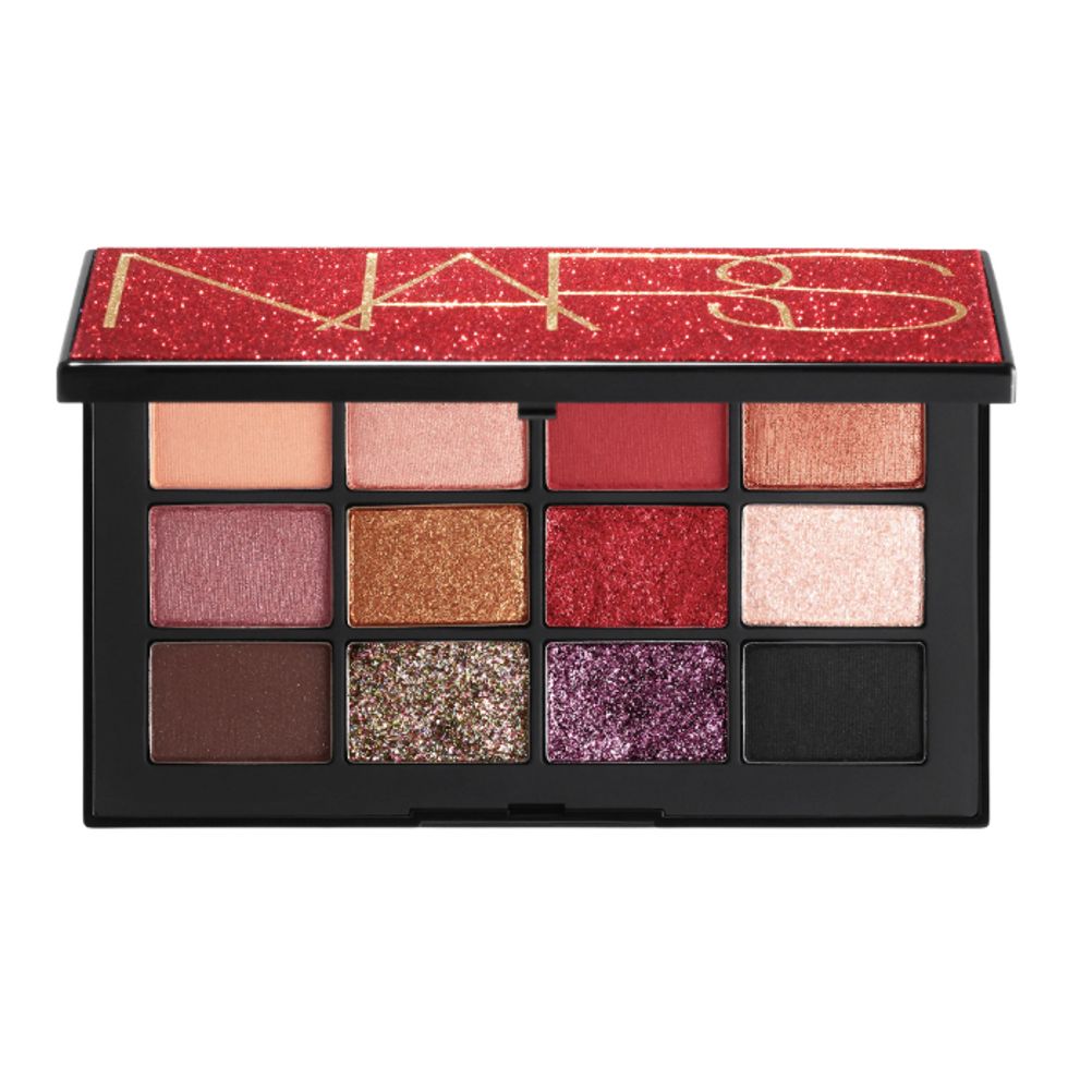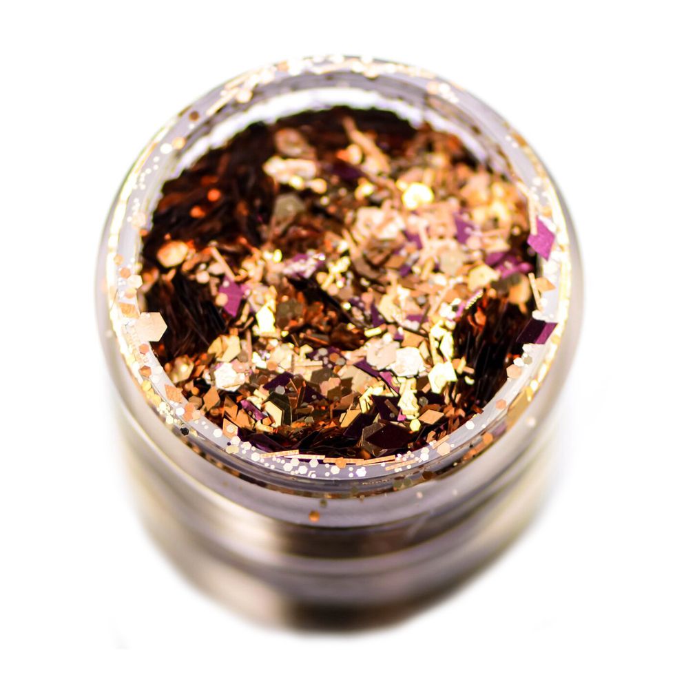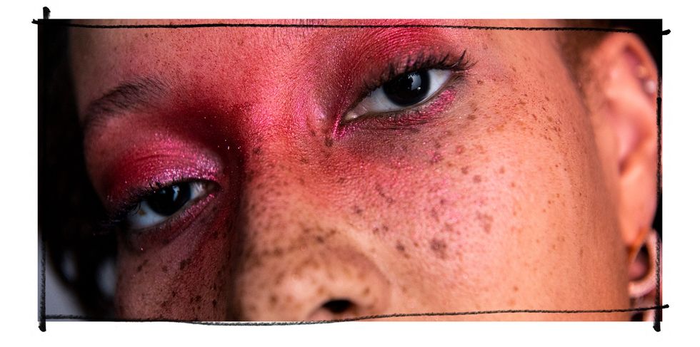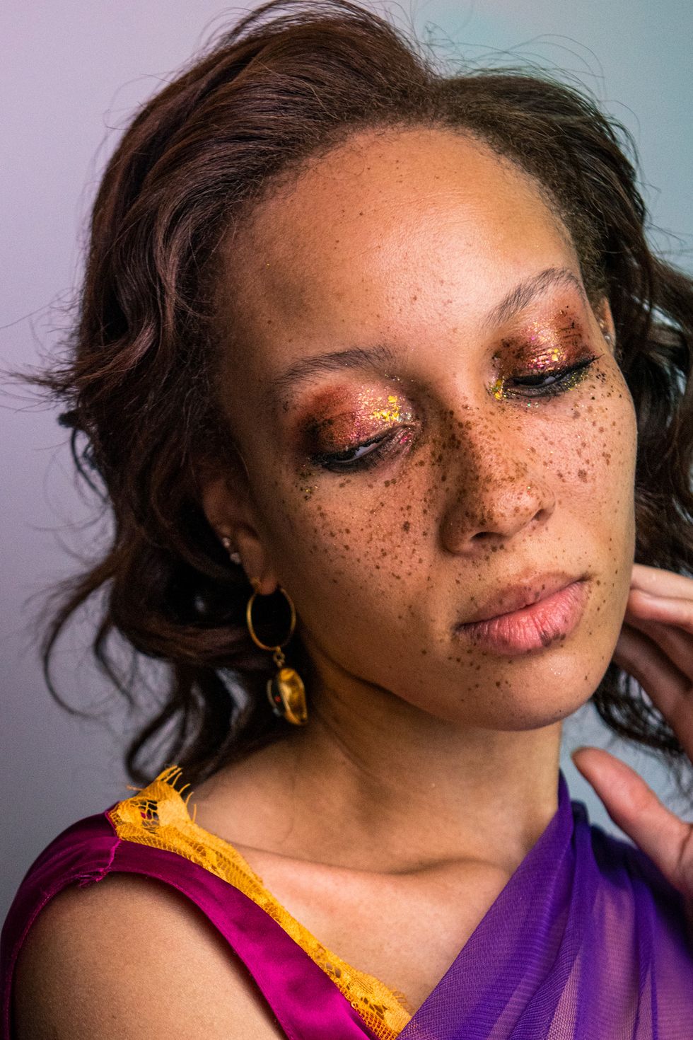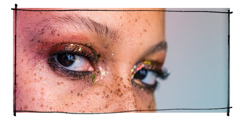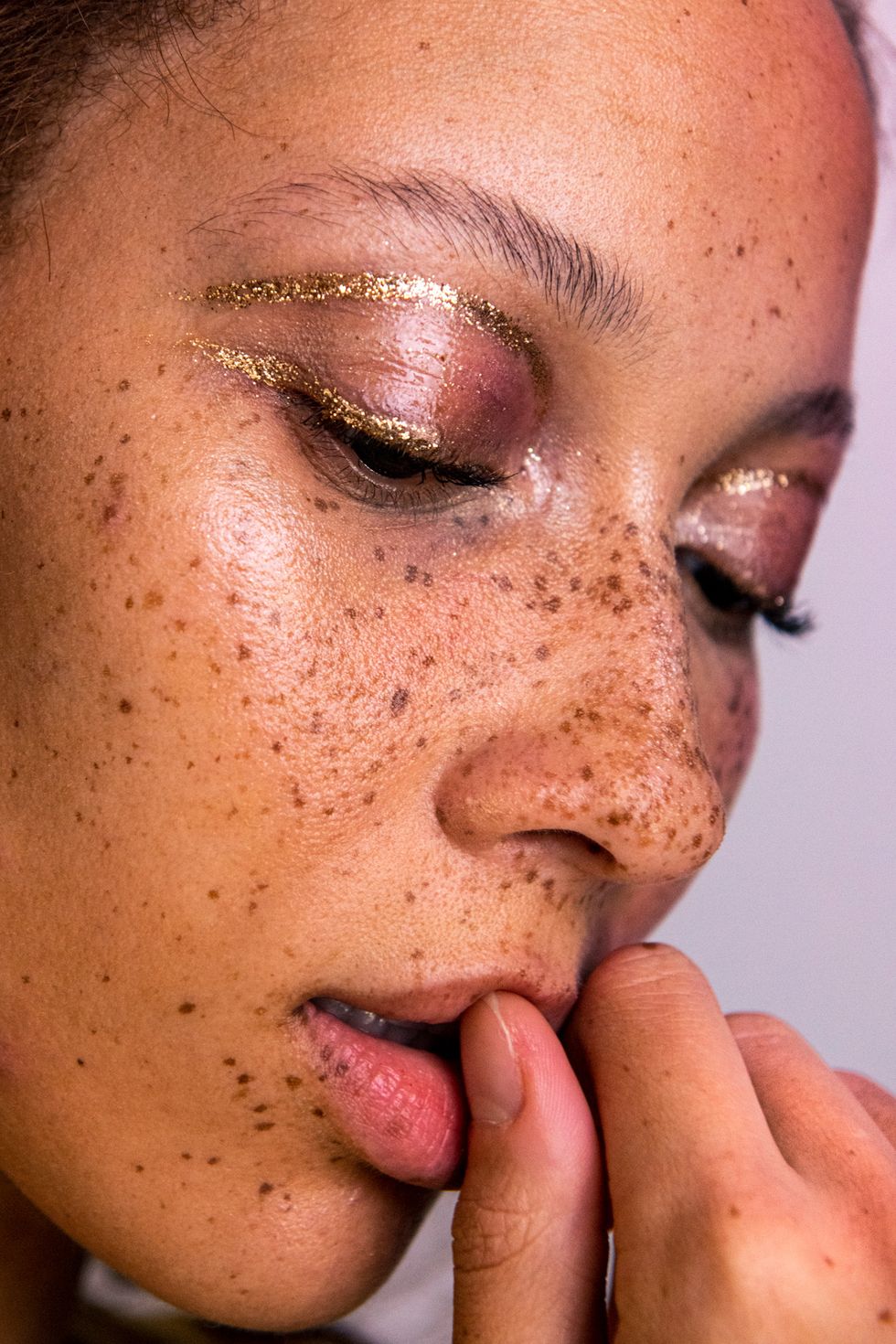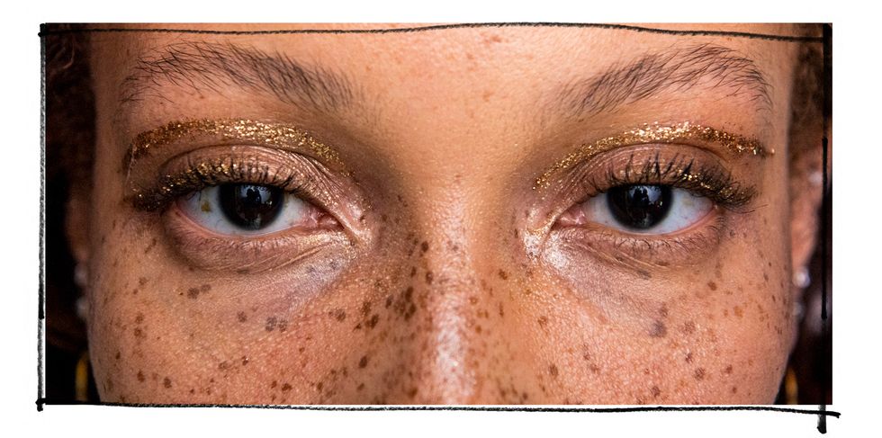 Not all glitter has to look cute and precious. Myles calls this a “grunge glitter moment,” and we are 100 percent here for it. The effect is more lived-in, as if you’ve already been dancing the night away with your friends, and embraces the idea that wherever the glitter falls during application, you leave it. The artist used contrasting colors—warm rust shades from NARS’ Inferno Palette in Rock Freak and Come to Me, topped with deep hunter and chartreuse green glitter flakes from Terra Moon Cosmetics in Poison Berry and Starry Eyes. Dampening your brush before you apply helps the larger flakes stick and prevent more fallout. If you have more glitter than you want in your under-eye area, use a cotton bud dipped in micellar water to remove the individual pieces. Don’t forget loads of mascara to perfect the look.
