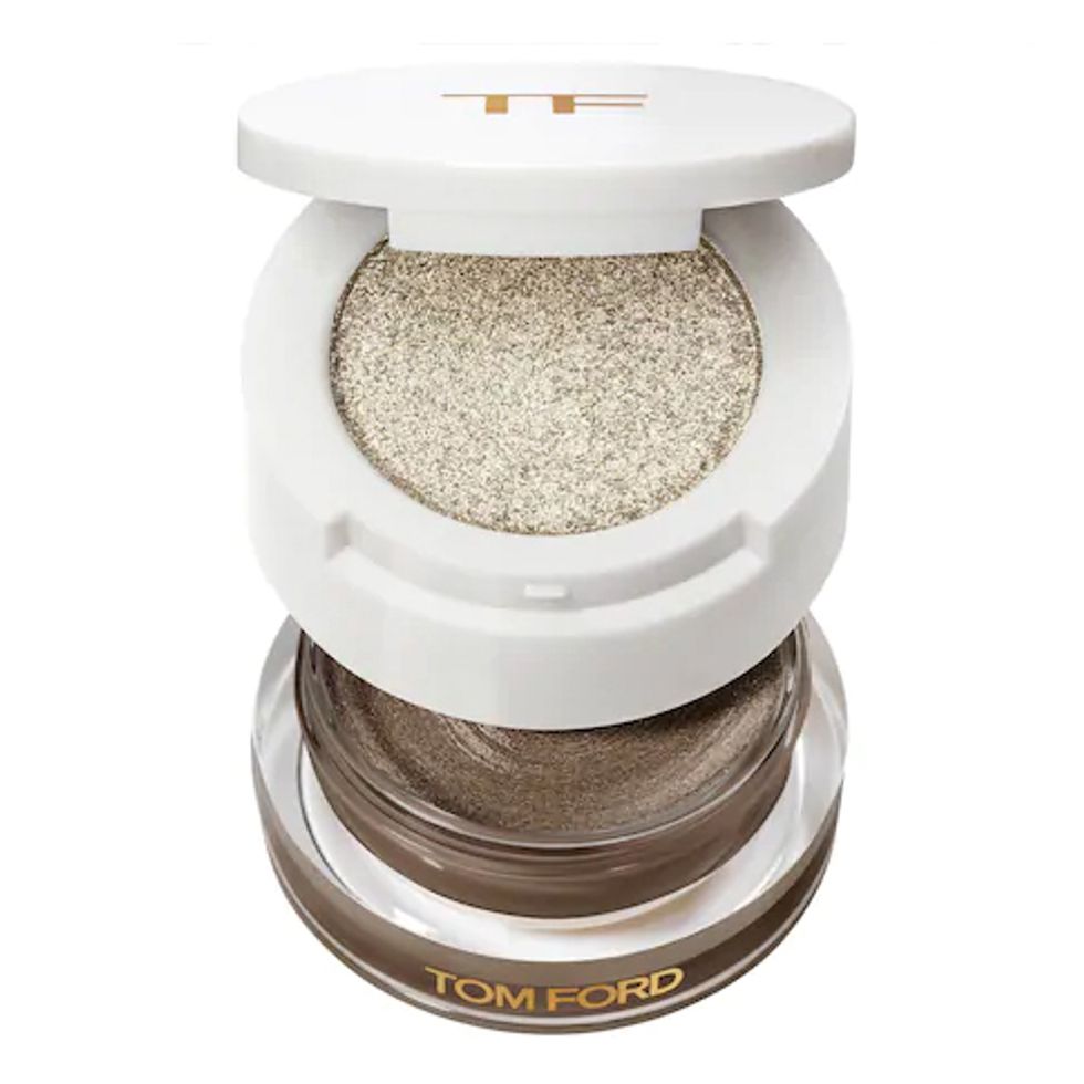 Glitter glue is your friend when it comes to this type of minimalist look. Myles mixed Ben Nye glue with loose glitter from MAC to form a paste. Start with a neutral base (this Tom Ford shadow is a gorgeous cashmere shade that looks flattering on anyone), then apply a small amount of lip gloss for some added shine and to help the particles stick. Then use a thin shadow or lip brush to paint on the lines, moving them up to help lift and brighten your eyes.