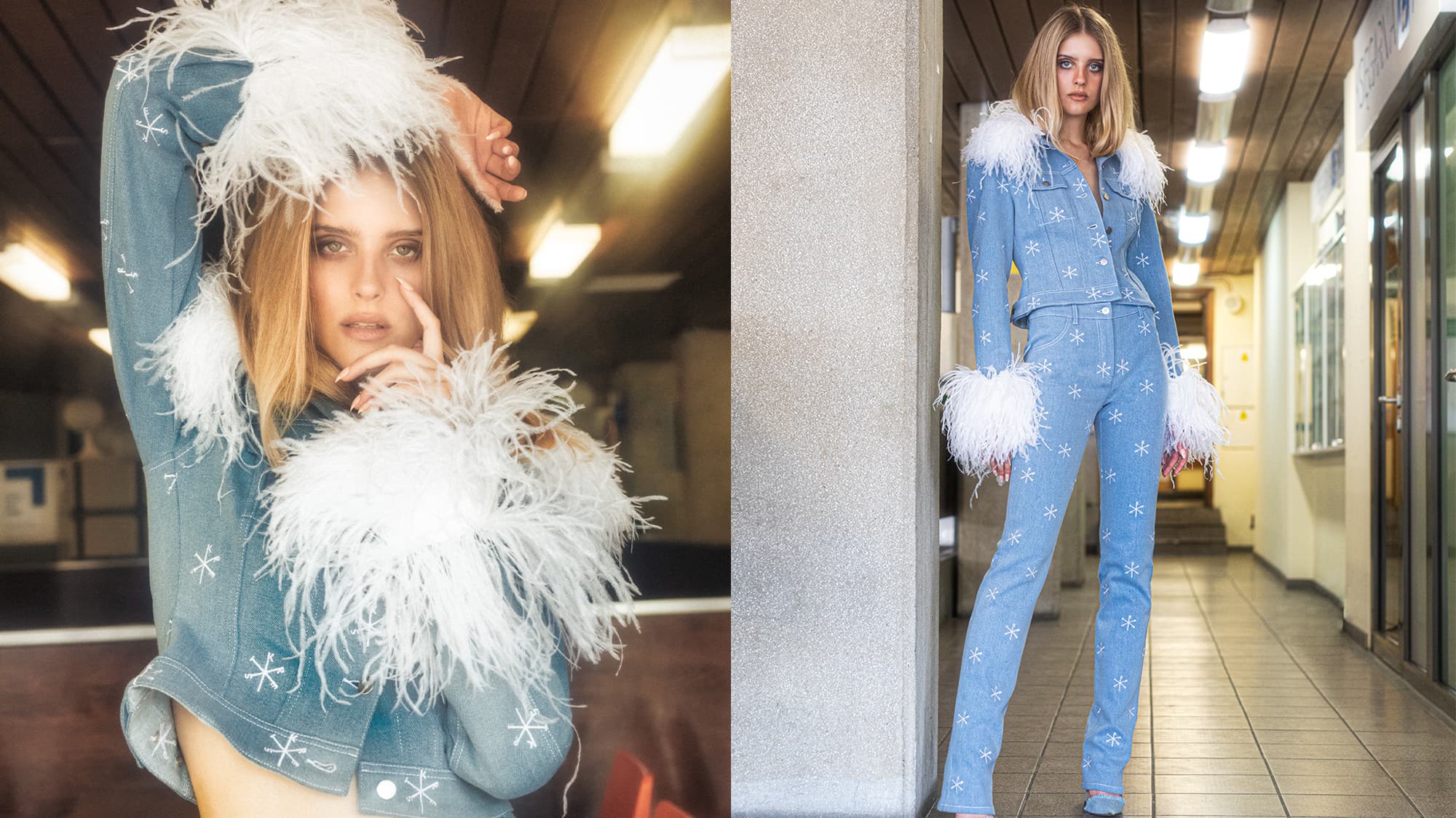 —have been spotted in the brand’s “denim couture” and ready-to-wear pieces, many of which incorporate hardware, fringe, and cutouts. “We often refer to Eastern European culture [in our designs],” Stróżyna explains. “Folk pieces, Polish craftsmanship, fashion from our Soviet past, architecture, etc. From the very beginning, we are about wearability, but we want the pieces to standout at the same time [and] to be adaptive and humorous. We also love to domesticate kitsch by using eye-catching colors, feathers, fringes, ruffles, pink fake fur, and a lot of shiny details.”