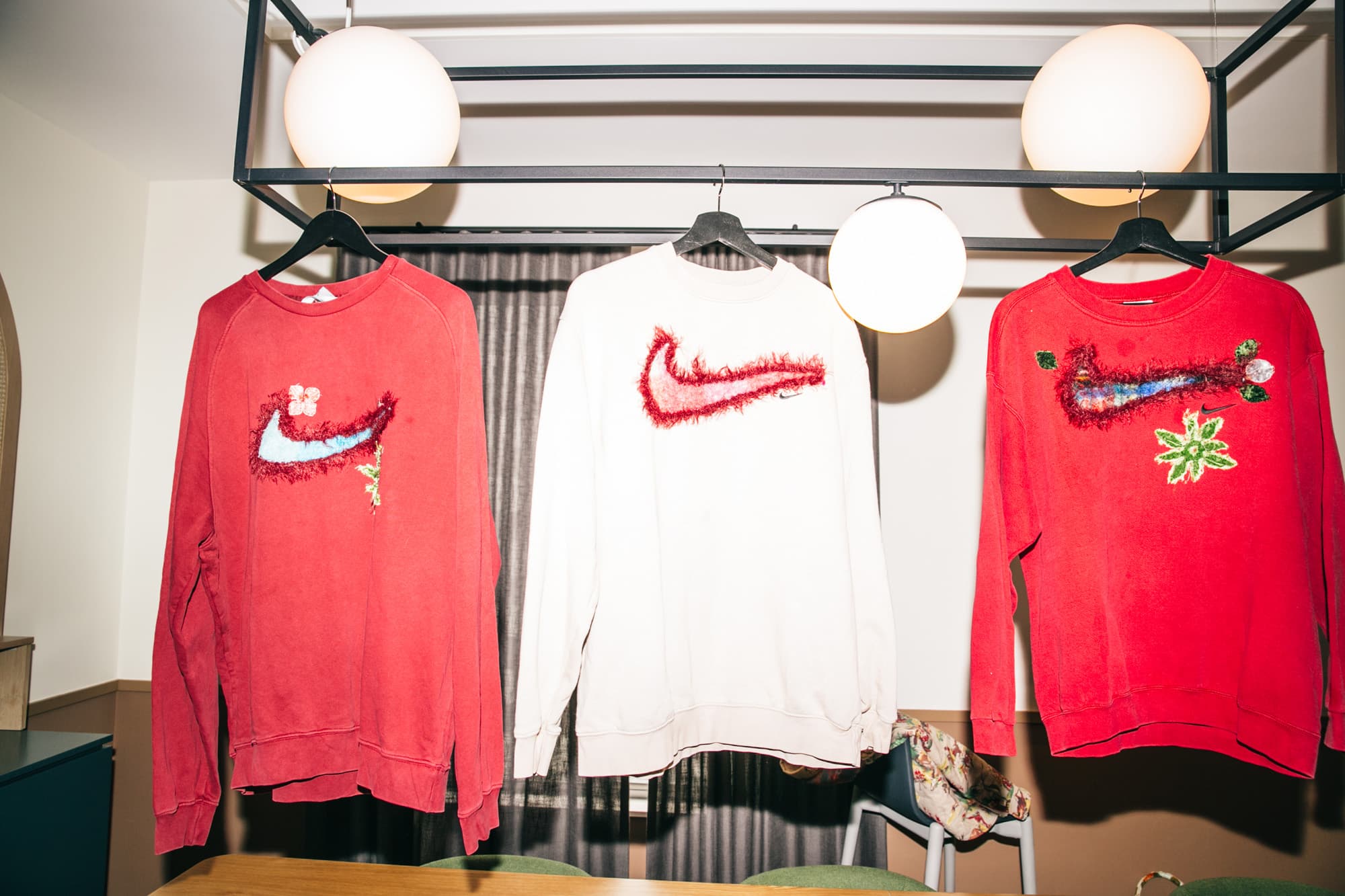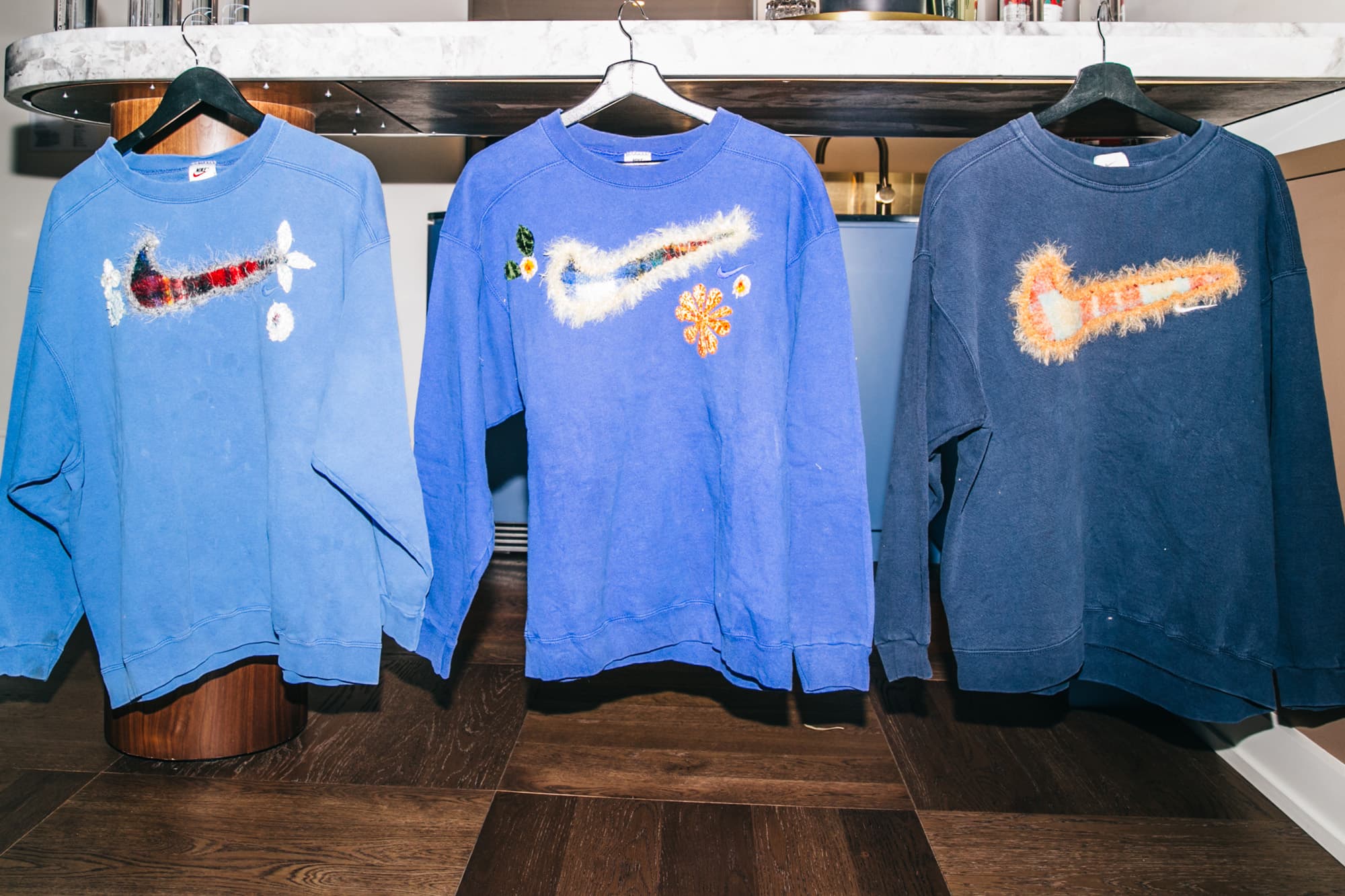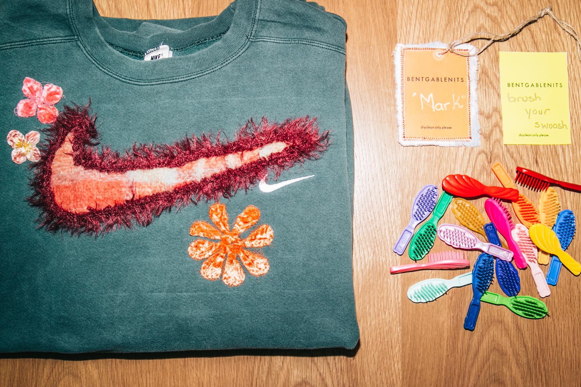 They've figured out the perfect formula to leverage their skills: Nitsopoulos sources vintage Nike hoodies and crewnecks, and Bent and Gable rework them by adding their own versions of Nike Swooshes using rope, silk flowers, knit details, and most recently, mohair. The mohair collection launches this Friday
