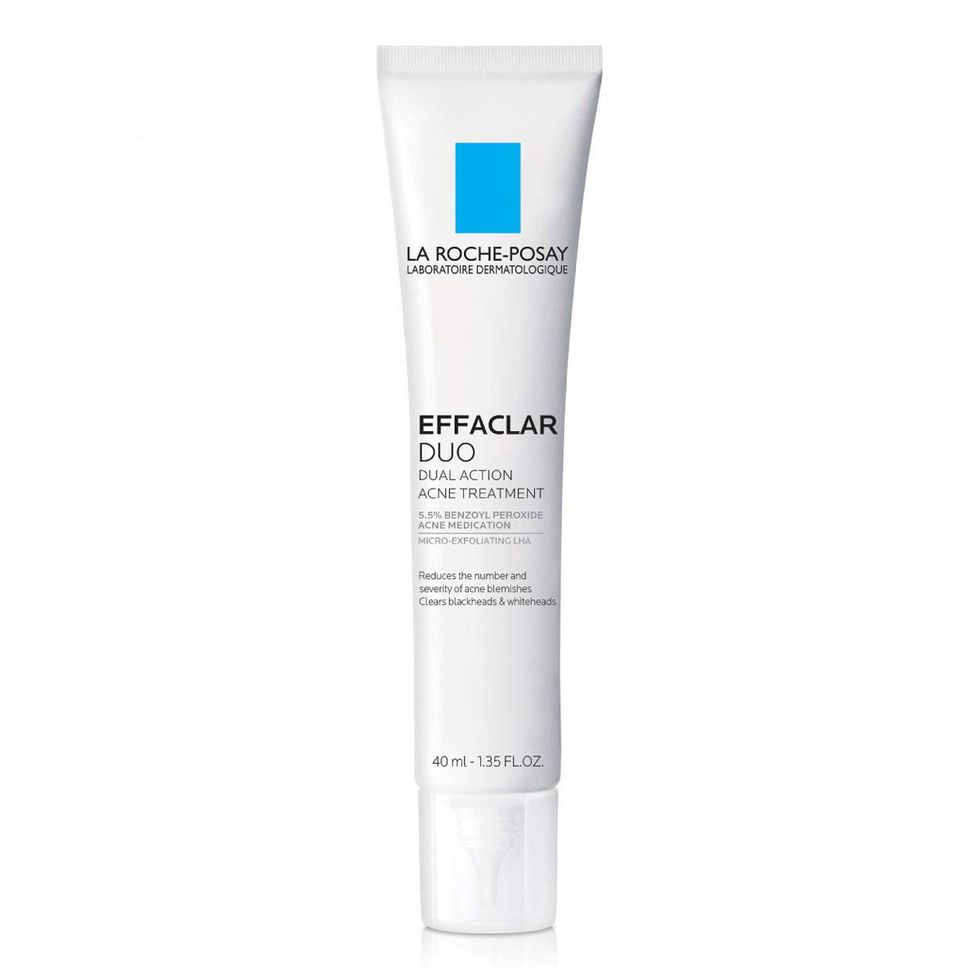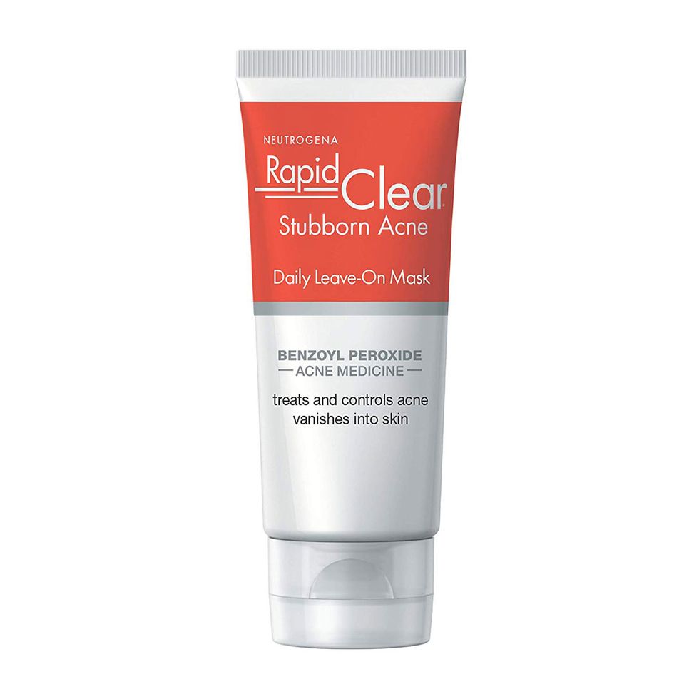 If you’re experiencing large, red, angry pimples (or “bombs,” as Dr. Zeichner calls them), he recommends using a product that contains benzoyl peroxide. “Benzoyl peroxide helps lower the levels of acne-causing bacteria on the skin and reduces inflammation to clear pimples. [Try] Neutrogena’s Rapid Clear Stubborn Acne Daily Leave-On Mask, which contains 2.5 percent benzoyl peroxide. It is important to treat the whole face because you want to clear your [visible and underlying] pimples, and you cannot predict where the next one will come in.”