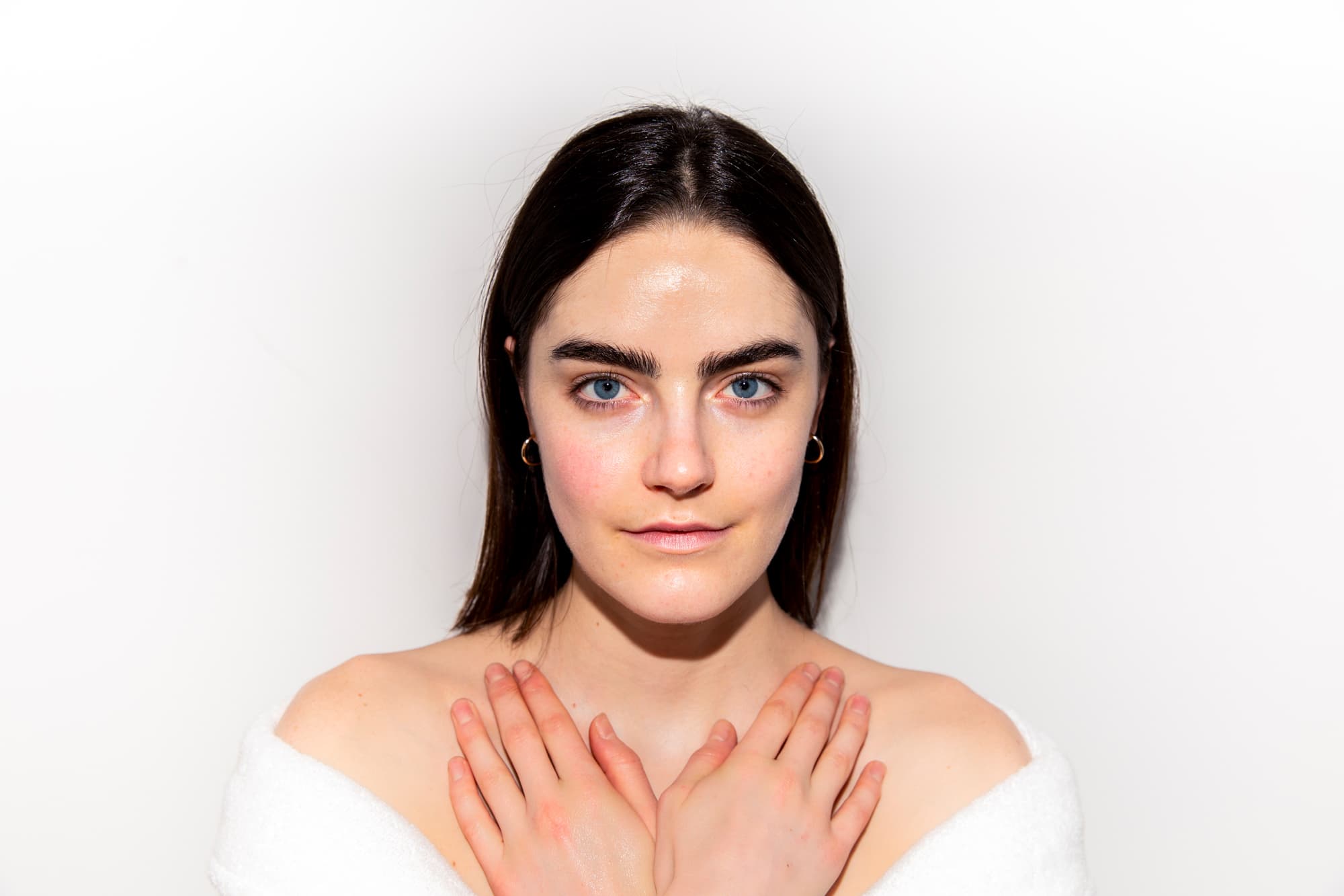4. Sweep the hands across the brows and forehead, moving from the center out towards the temples.