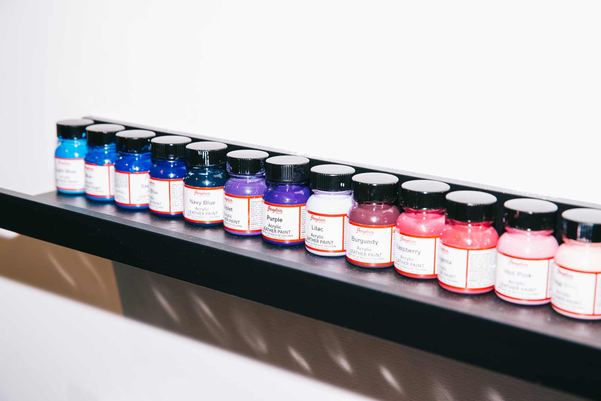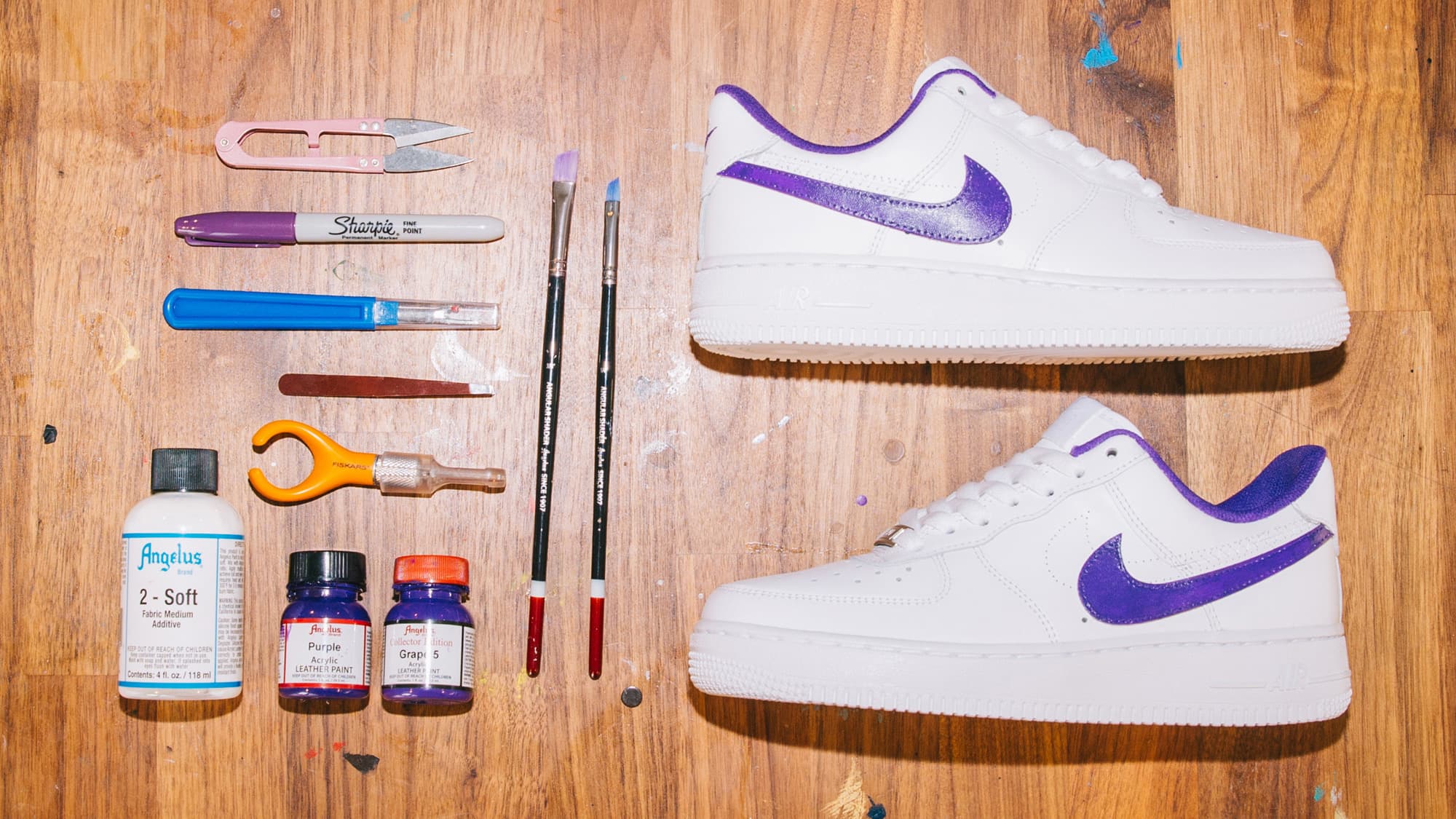 The first thing was to move the Swoosh down an inch or so, and so the first order of business was using a stitch ripped to remove it from the sneaker. TBH, this was the most meticulous and time-consuming step—I had to be careful not to pull on or rip the wrong thread, and you want the Swoosh to come off as smoothly as possible. Once that was completed, it was time to paint them. My color of choice? Royal purple (purple is my favorite color, but I