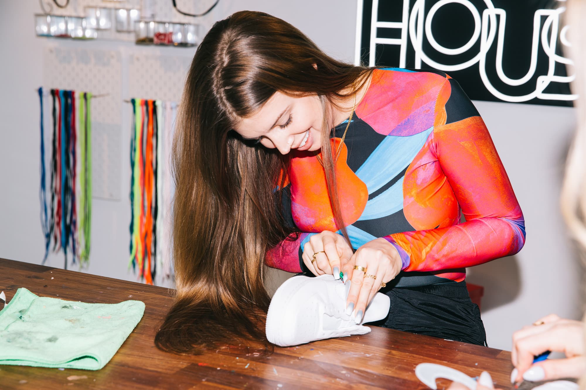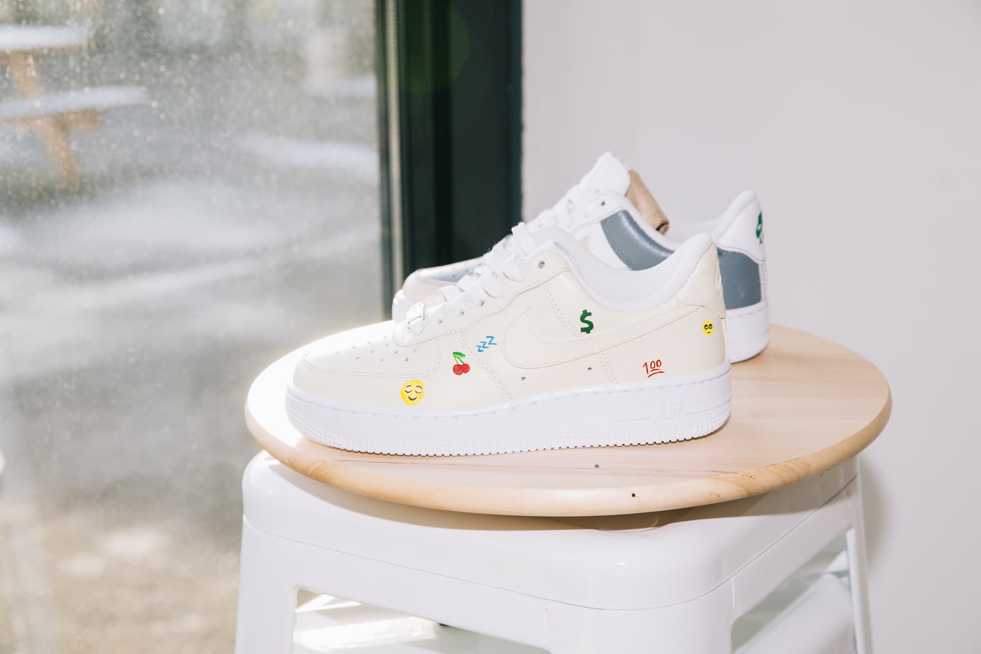 s innovative market made of jet-black shipping containers. As soon as I arrived at the space, she walked me through all the options I had to personalize my fresh white Air Forces; there was everything from paint (the same kind that Nike and Jordan use) to stamps, lace caps, stitching options, new materials to add, and the list goes on and on. I