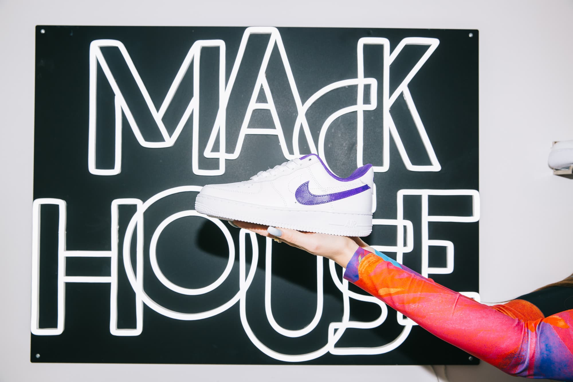 m bad at making decisions on the spot, but I came into Mack House knowing that I wanted to include purple in some way. I also had come across a picture of a shoe with a Swoosh unstitched and restitched lower down, and I wanted to re-create that on my shoe. I explained it to Weaver, and she suggested I also paint the inside of the sneaker purple—something that I didn