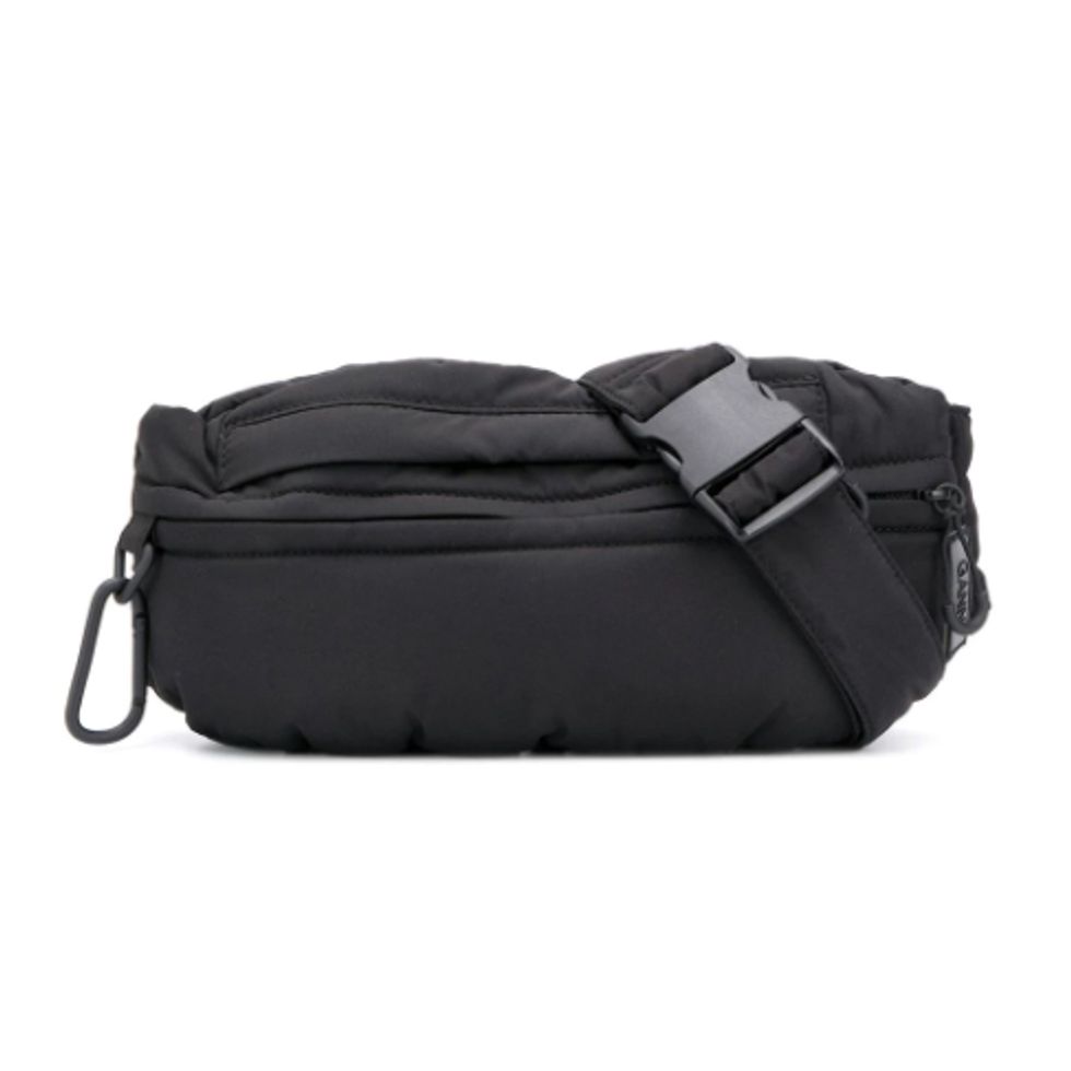 “A fanny pack worn crossbody. Current pack in rotation is a handmade one constructed from a black-and-white patterned IKEA bag that I bought on a recent trip to Japan.”