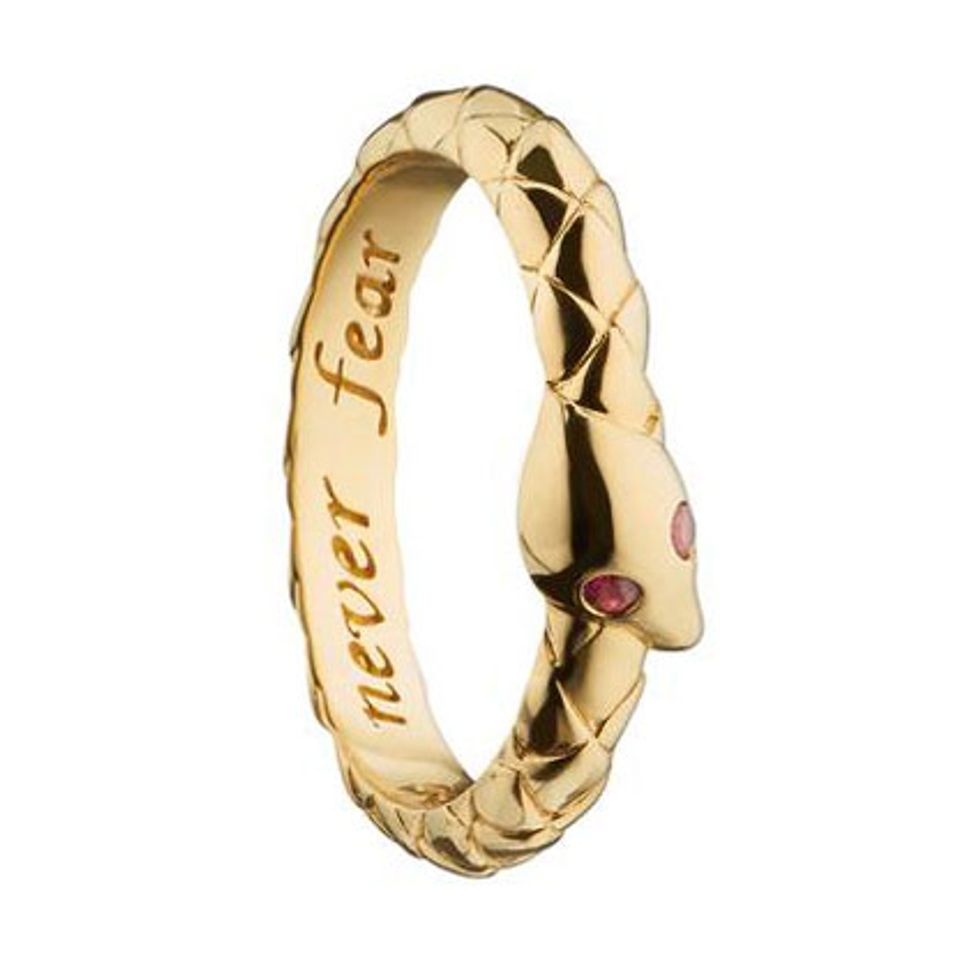 I’m still trying to find the meaning in everything this year—and my jewelry is no exception. So it’s fitting that Monica Rich Kosann just reinvented the 15th century tradition of “Poesy” rings inscribed with hidden messages. The collection’s sentiments like Never Fear, Unity, & Courage reflect the lessons I’ve learned this year and feature timeless designs like signets, enamel, and this must-have snake.