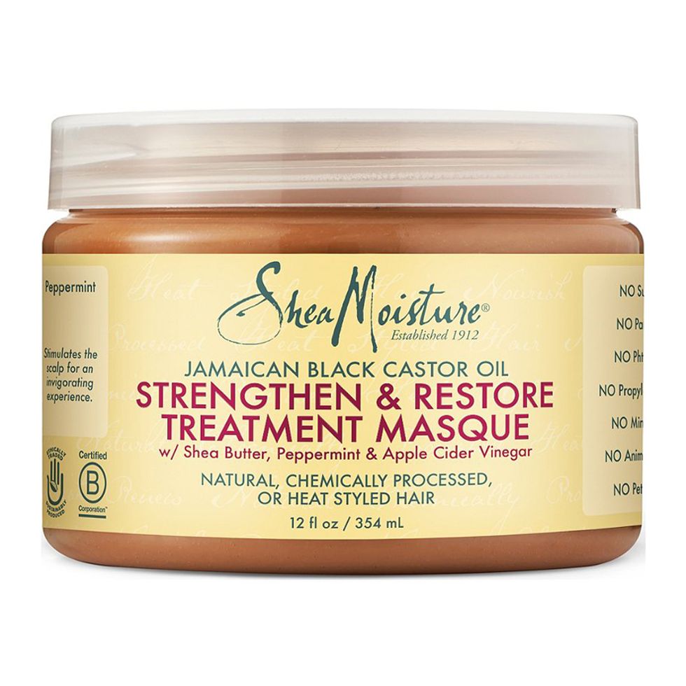 “I love to rinse olive oil in my hair once a week, so I’ll leave that in overnight before washing. When washing my hair, I’ve found Christophe Robin’s Cleansing Purifying Scrub with Sea Salt really gets your scalp clean and fresh. I’ve also been obsessed with SheaMoisture’s Jamaican Black Castor Oil Strengthen & Restore Treatment Masque, which I usually apply to damp hair after giving it a wash. I’m on the lookout for another leave-in conditioner [that doesn’t contain coconut oil].”