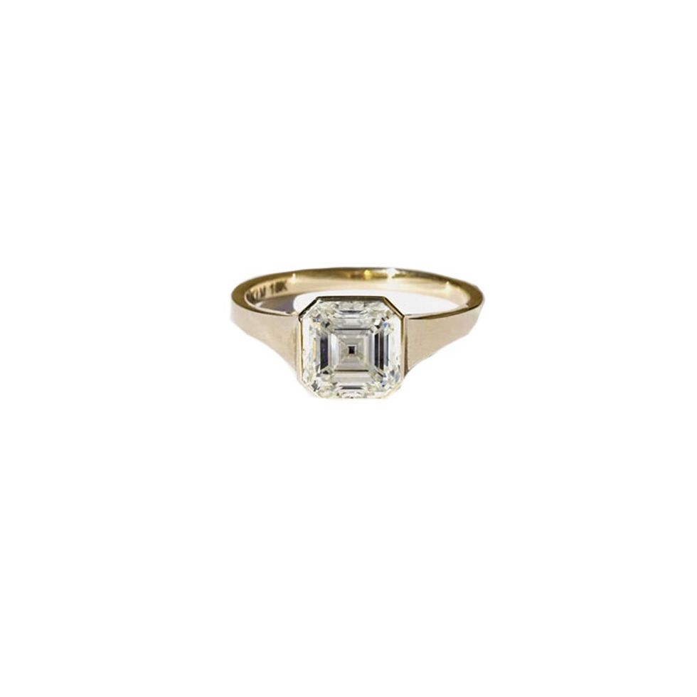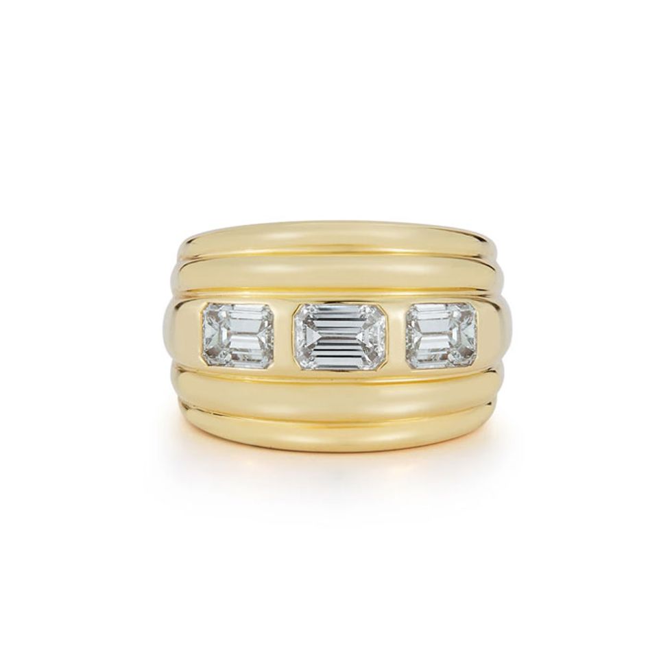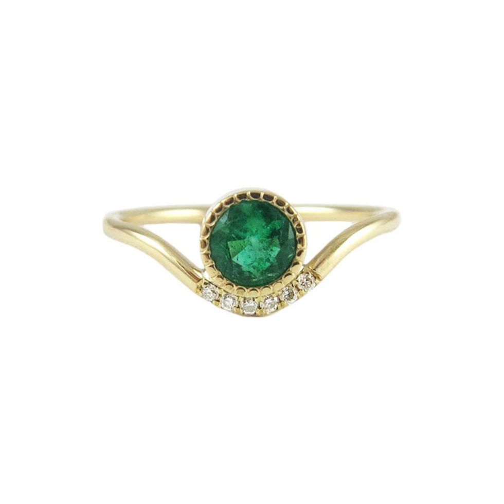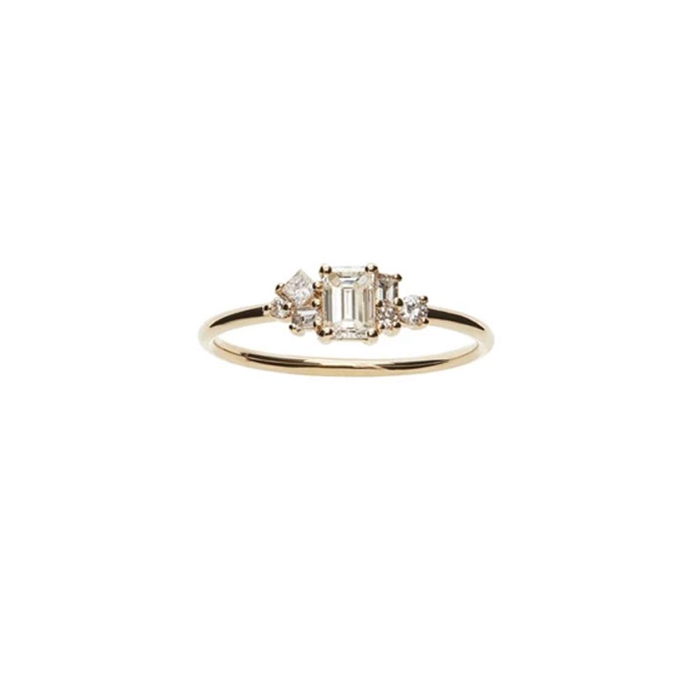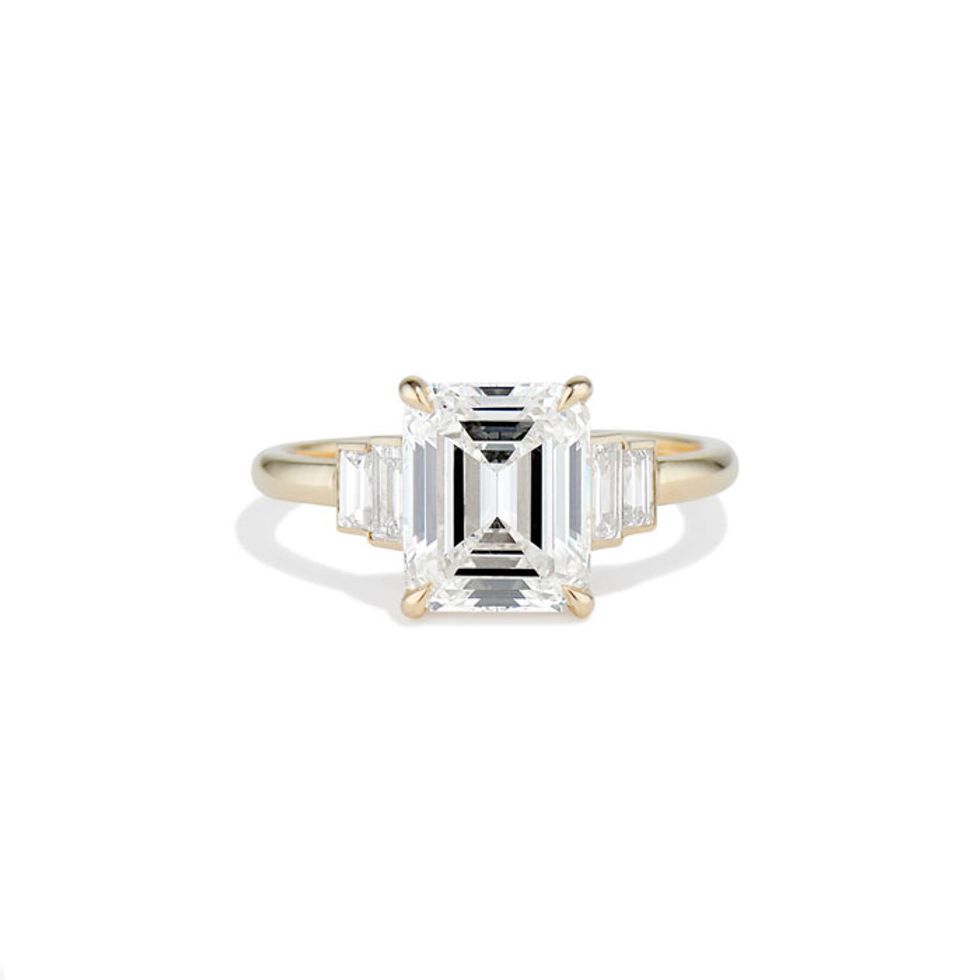We’d be shocked to find someone who isn’t familiar with the 1948 DeBeers “A Diamond Is Forever” advertising campaign, which marked the rise of white diamonds as the new standard for engagement rings (as opposed to different-colored gemstones like rubies or emeralds, which were popular in earlier decades). These campaign images also used a white solitaire brilliant-cut diamond, a style that contains many facets to promote maximum sparkle and luminosity, making this particular cut the unofficial go-to for bridal jewelry—and prompted other brands to feature brilliants (almost exclusively) in their campaigns for years to come.That trend has slowly evolved in the last few years, according to Yau and Révész. Says the latter, “Emerald and marquise cuts have been very popular this past year, in addition to oval, and when we do have requests for round, brilliant white diamonds, it’s typically paired with a classic bezel setting where the diamond is framed in gold or white gold. While round brilliant diamonds could definitely fall into ’norm’ land, it truly depends on the design of the ring and setting.” She cites Ceremony’s ’Yasmin’ ring, which features a “toi et moi” style with two round diamonds, as an alternative to this classic design while still paying homage to the traditional brilliant cut.