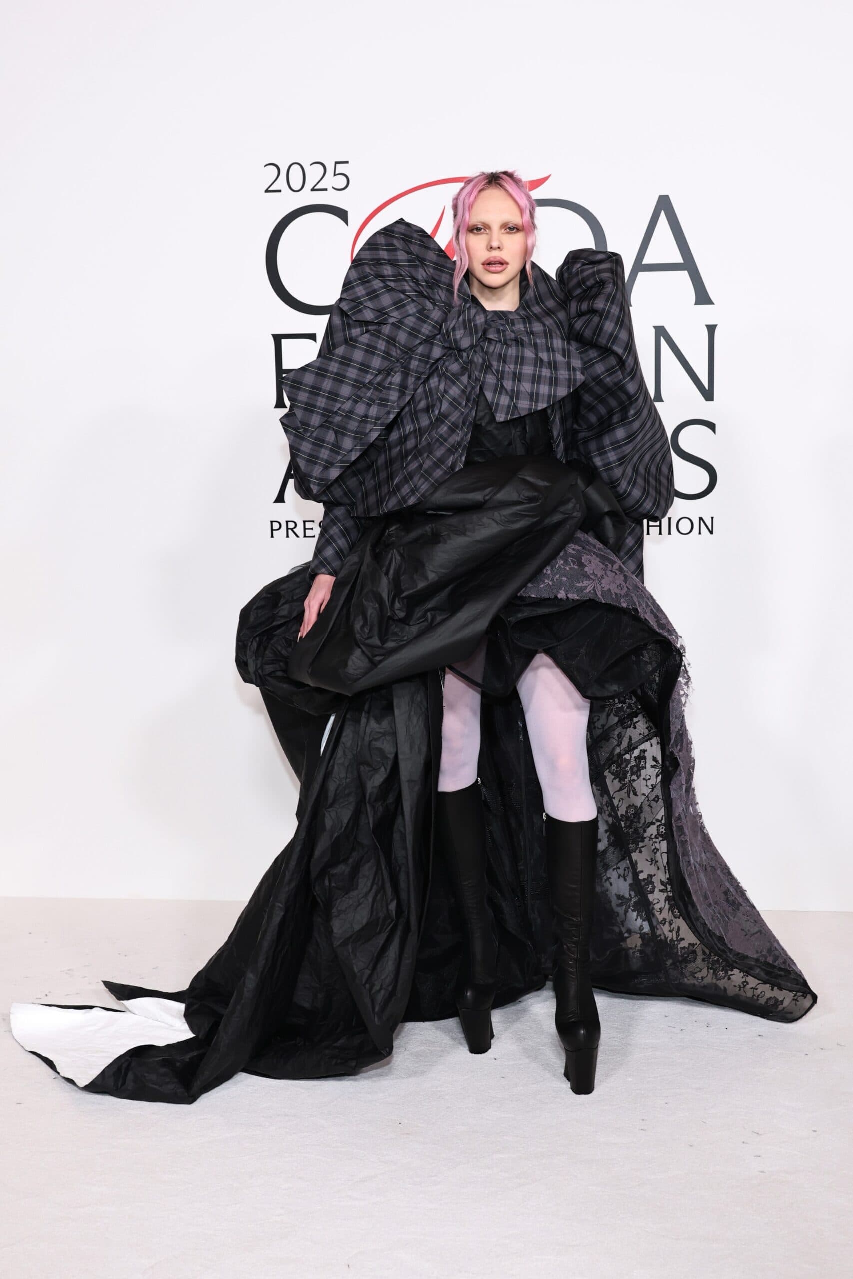 Getty ImagesJT brought the naked dress trend to the CFDA white carpet in a chain metal Jane Wade dress from the Spring Summer 2026 collection. She added a pink off the shoulder fur detail making the complete look multi-textural and multi-dimensional.