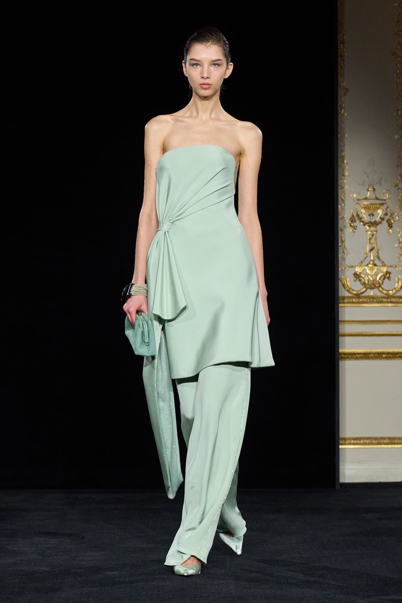 Armani Privé Spring/Summer 2026 LaunchmetricsMy prediction: we will be seeing mint green on everyone come spring and summer. Mint green comes in many forms and both muted and full-bodied variations. Chanel's runway featured layered sheer mint green dress with lace embroidery. Dior made a case for muted mint in the form of a boxy polo-style shirt. Amrnai Privé featured a monochrome mint set: a strapless dress paired over trousers with mint green kitten heels and a matching clutch.