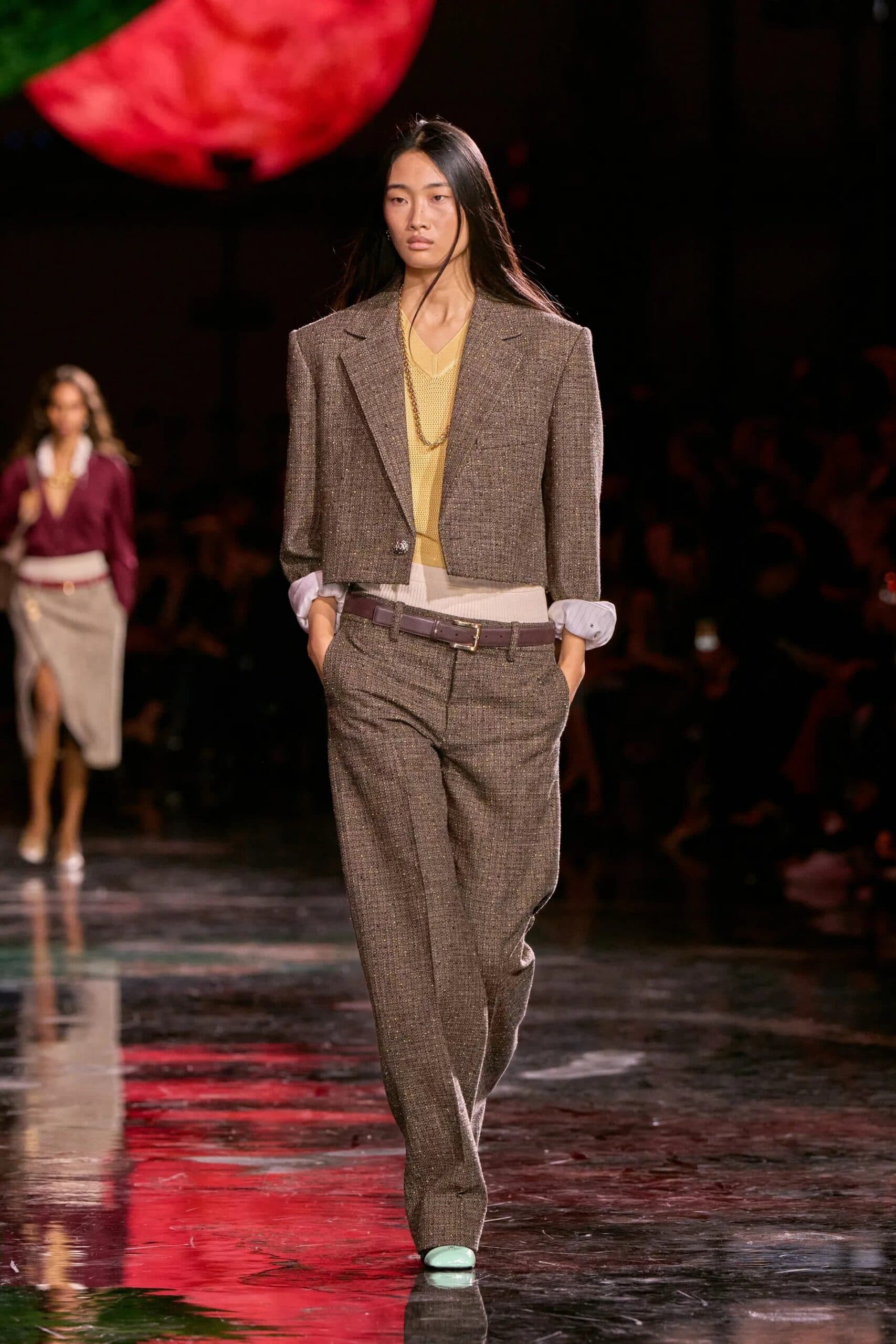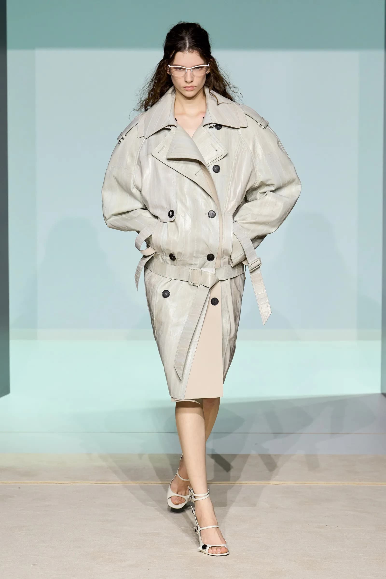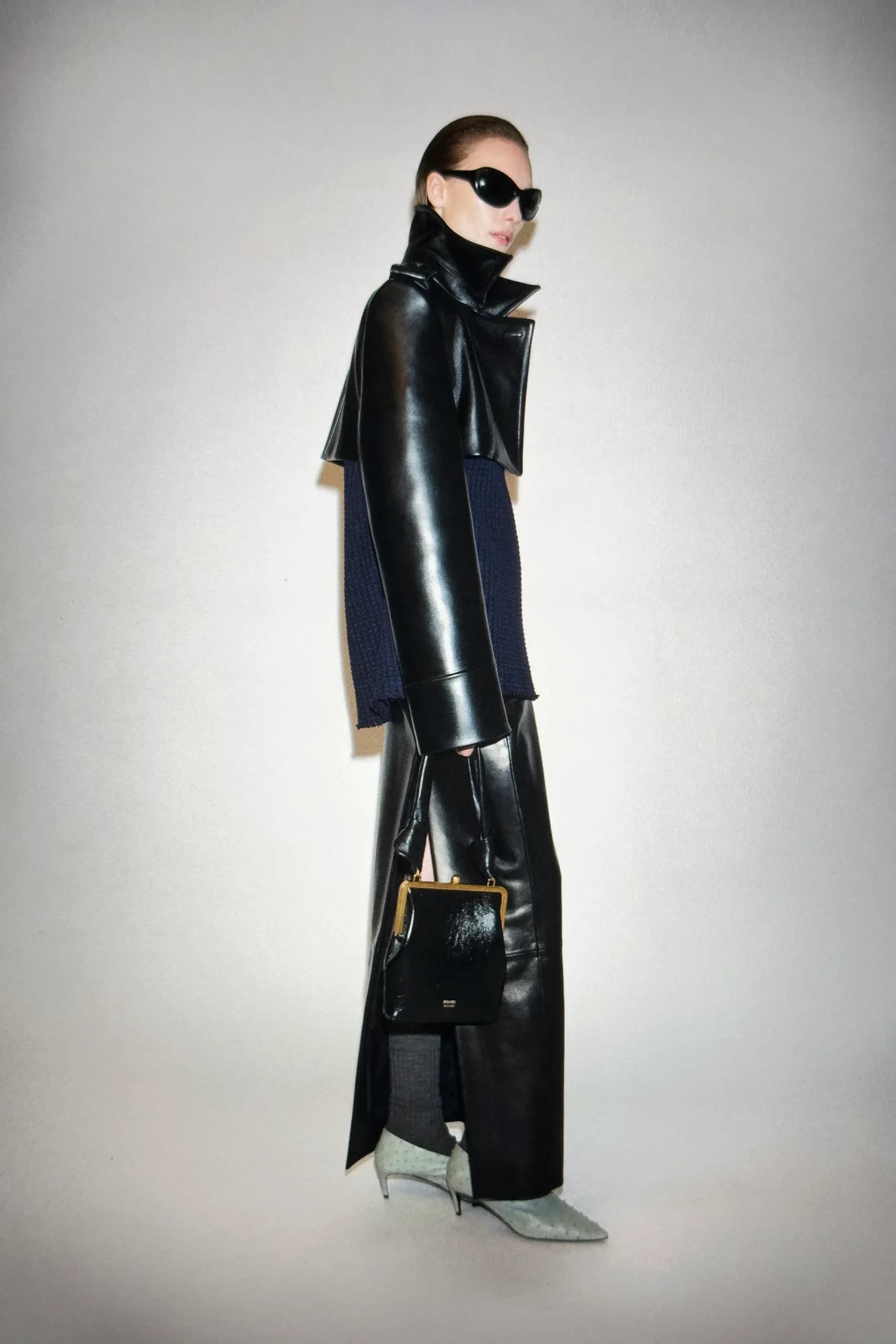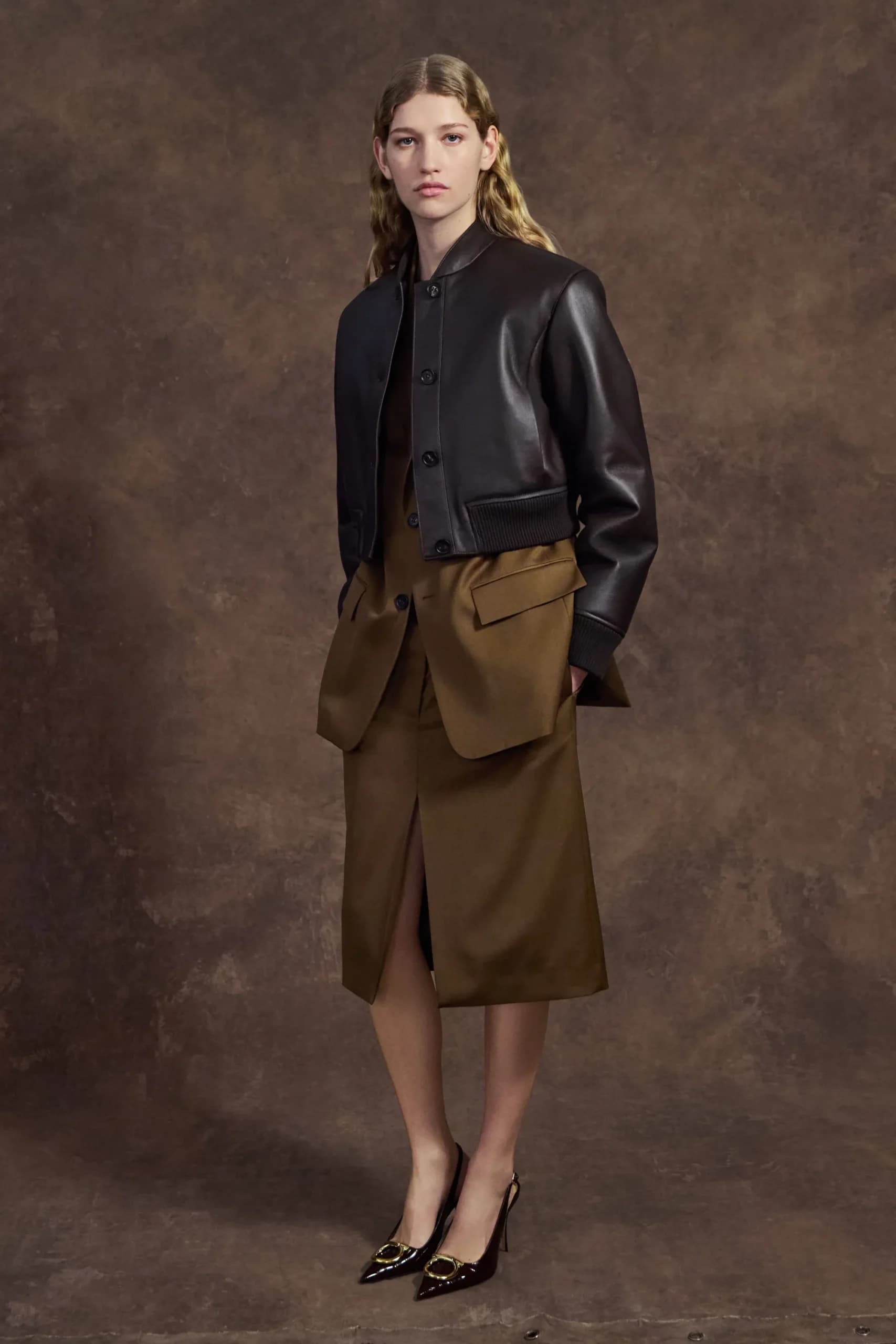 Ferragamo Pre-Fall 2026 FerragamoLeather has been a mainstay trend for most of 2025 and plenty of 2024, and it doesn’t seem to be moving out of the spotlight any time soon. These past two seasons have put an emphasis on high shine, non-patent leather that has an expensive, illustrious quality. At both Khaite and Ferragamo’s Pre-Fall 2026, these were key themes throughout the collections. At Khaite, black, ultra-shiny leather pieces were offered in high-waisted, double-breasted skirts, tiny cropped jackets, classic straight leg pants, and simple blazers similar to the ones offered in Cate Holstein’s Spring/Summer 2026 collection.