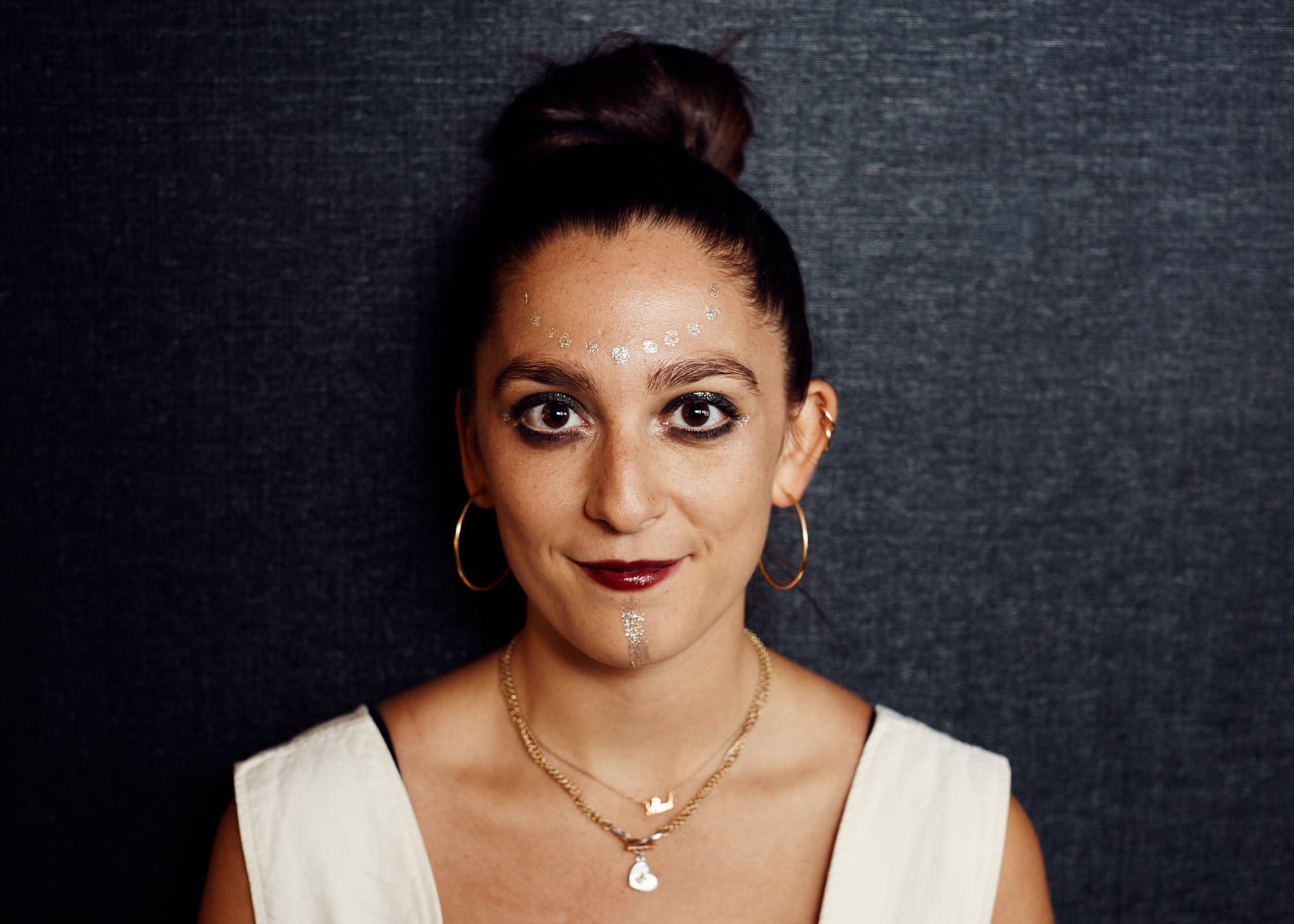 as a base. Using your fingers, smudge it over the eyelids and under the lower lash line. For saturation and longevity, apply a glittery black eyeshadow on top using a flat shadow brush.