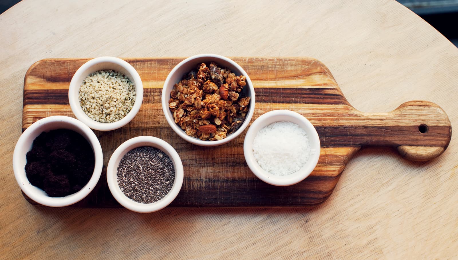 THREE>> Remove mix from blender into bowl, sprinkle desired toppings (the ones listed above are all great superfoods with amazing health benefits).