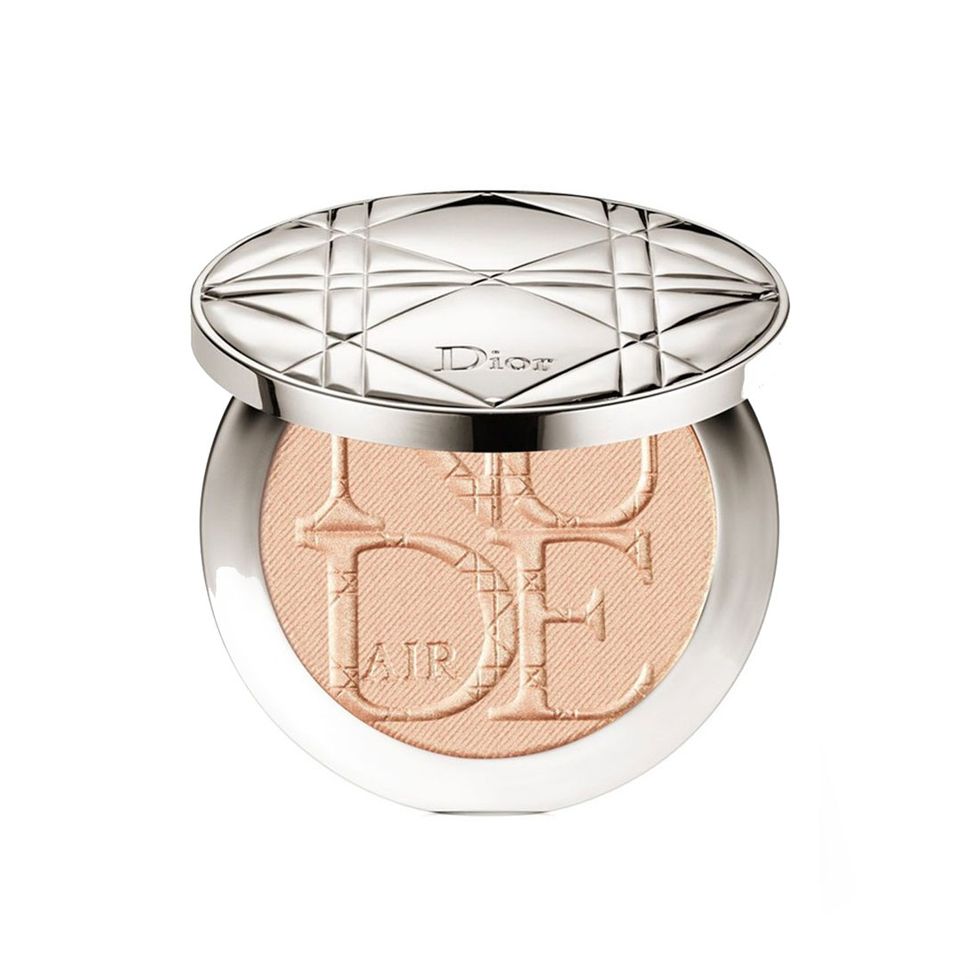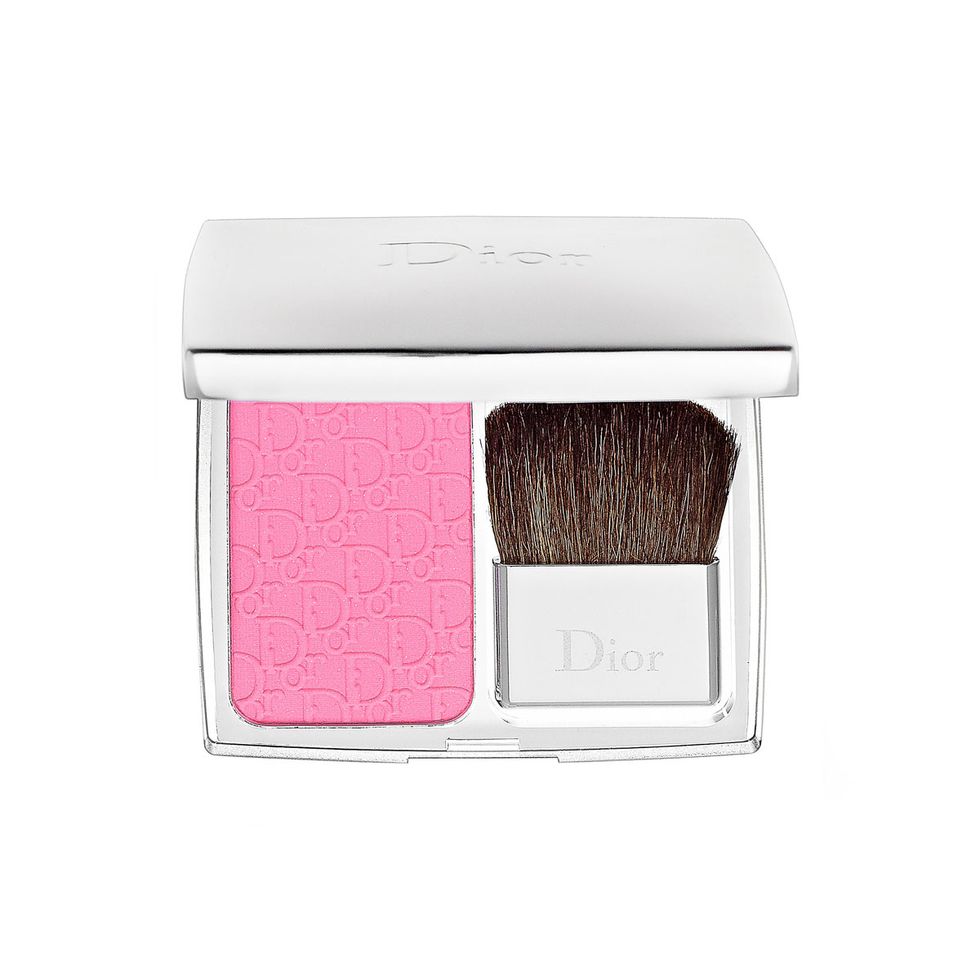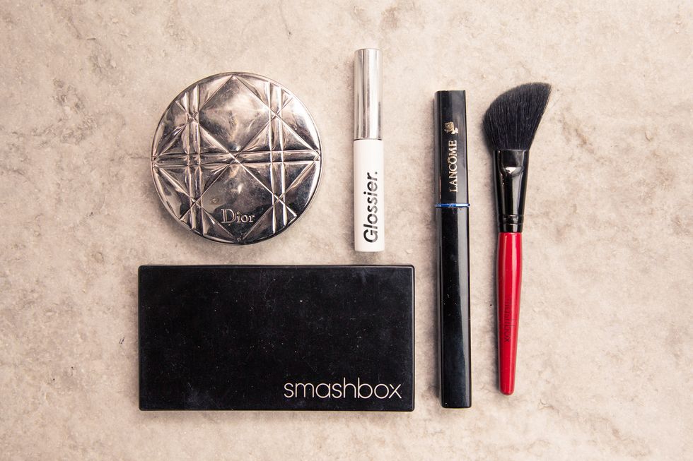 “I love makeup, so there are days when I will bring out my whole kit, but on a normal day I’ll just do some Clé de Peau Concealer—it’s the best. [I put that on] under my eyes. My face is really calm now, but for a while it was acting up so I have a little bit of old acne scarring to deal with. It needs a little camouflaging. If I’m feeling sassy or puffy, I’ll do a little contour—not every day, but I do love a highlight. I can’t help it. This is a Diorskin Nude Air Luminizer Powder, and I’ll just pop it at the top of my cheekbones and eyebrow. A makeup artist told me to put it in between the eyebrows, weirdly, too. I’ve been doing highlighter since high school. I don’t want to say I’m prophetic, but I love it—I love a shimmer. And then I add a little blush because I’m super pasty. This is really old [blush], I got it for my wedding—Dior Rosy Glow.”