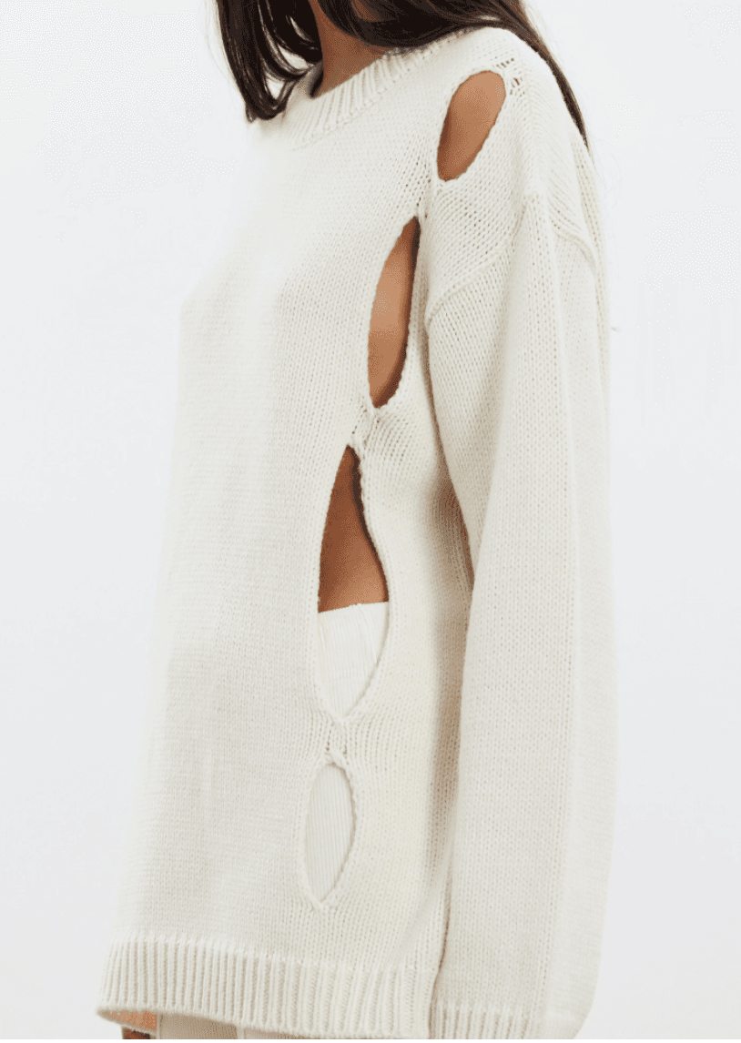 Whenever I start shopping for fall clothes, I always try to look for a few things that stray a bit from a basic knit––and this one from Source Unknown definitely checks the box. Not only is the cut-out detailing perfectly on trend for the season, but it also gives it so much potential for dressing up or down. Pair it with a nude bodysuit underneath for a neutral, elevated look, or a black silky bralette and leather pants for a night out.