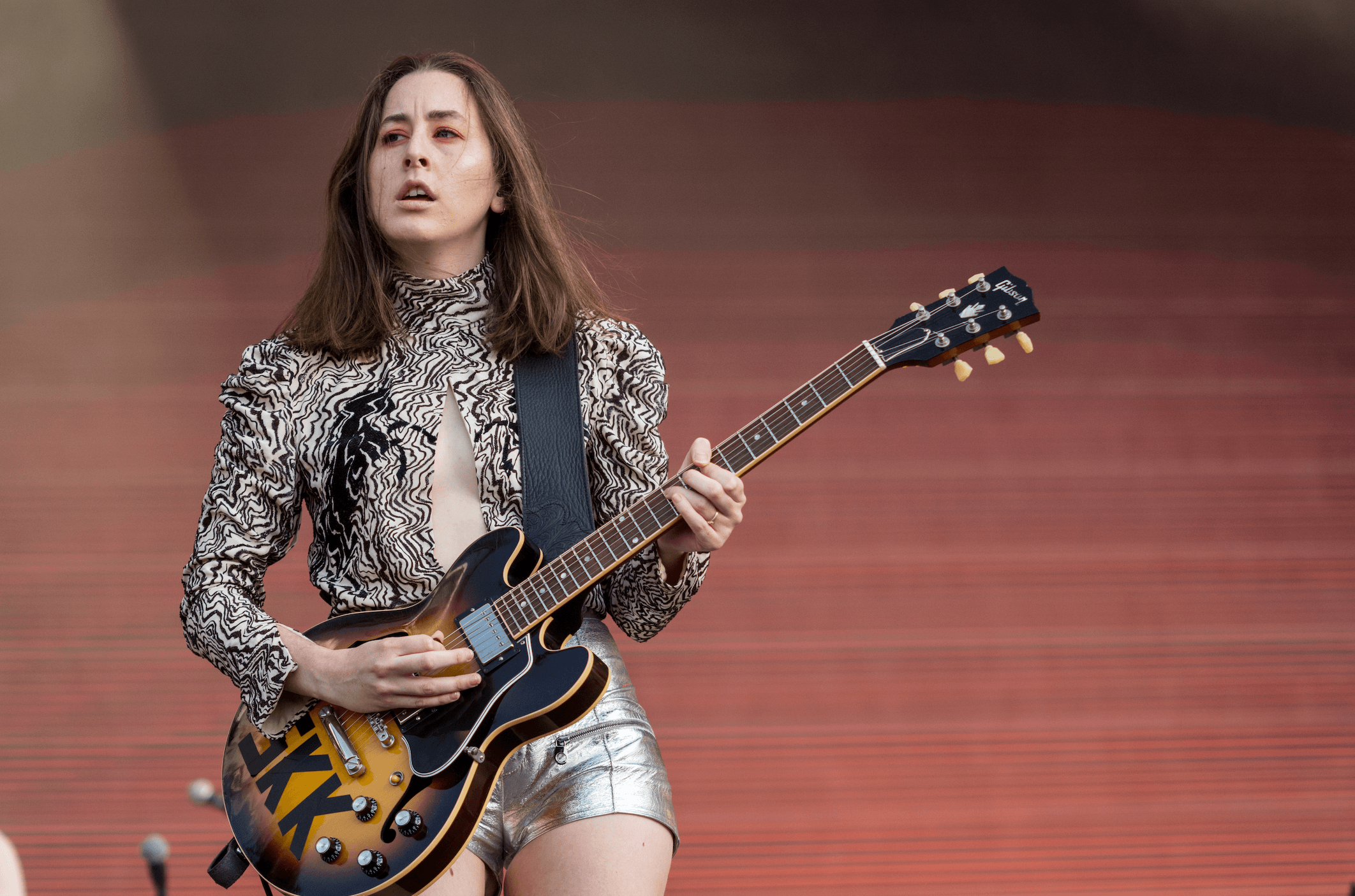 For their second stint on the road, the Haim sisters worked with their stylist to conceptualize a vibe. “We really wanted things that could reflect light because our set had mirrors on it, everything was reflecting light.” They settled on fake PVC leather pants. They looked fantastic, but the reality of a tour means each night you're sweating in a pair of pants you cannot wash. "We had to wash them with vodka," she grimaces, noting how they would spray down the pants each night like a theater company cleans their costumes. They even went so far as to freeze them in order to disinfect the materials.