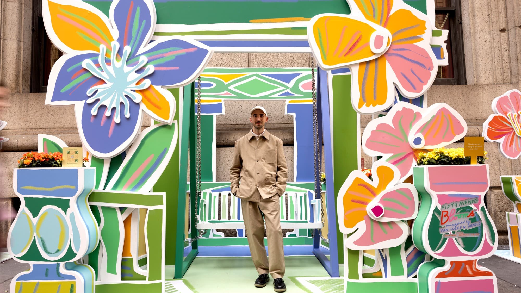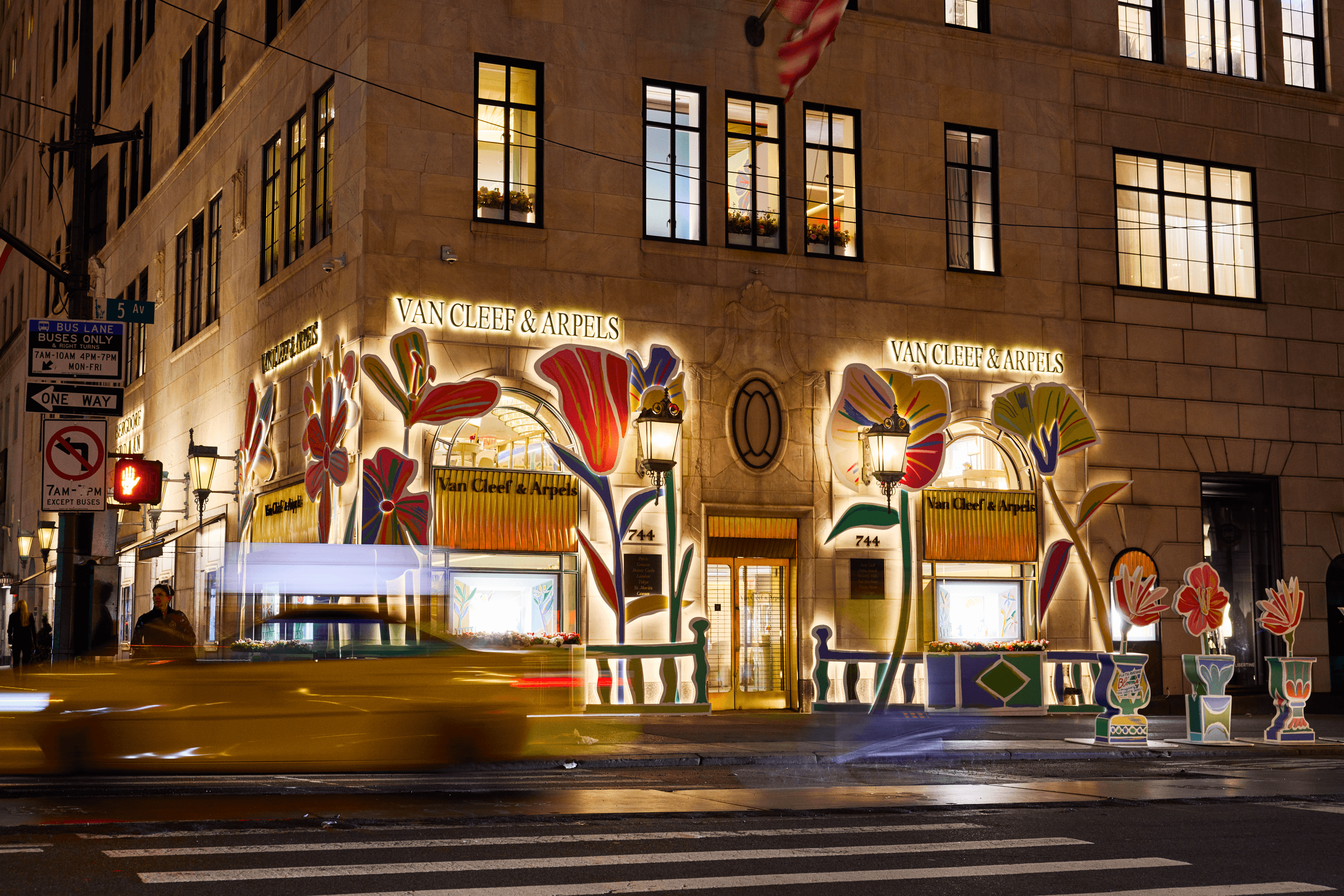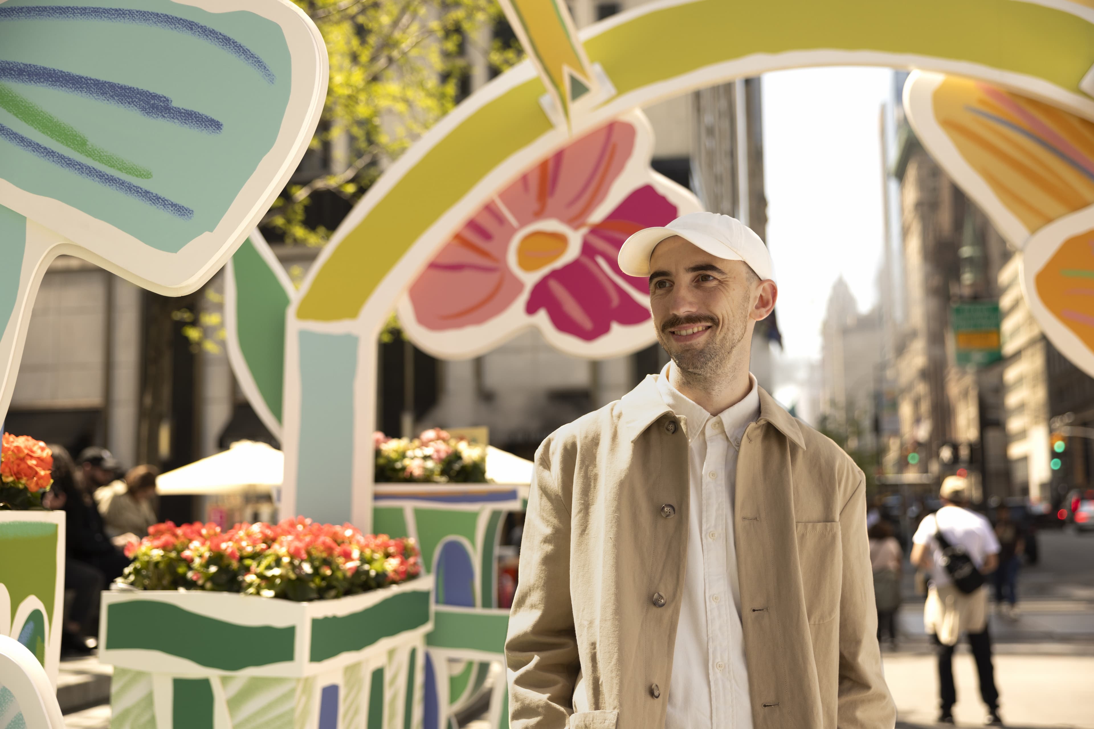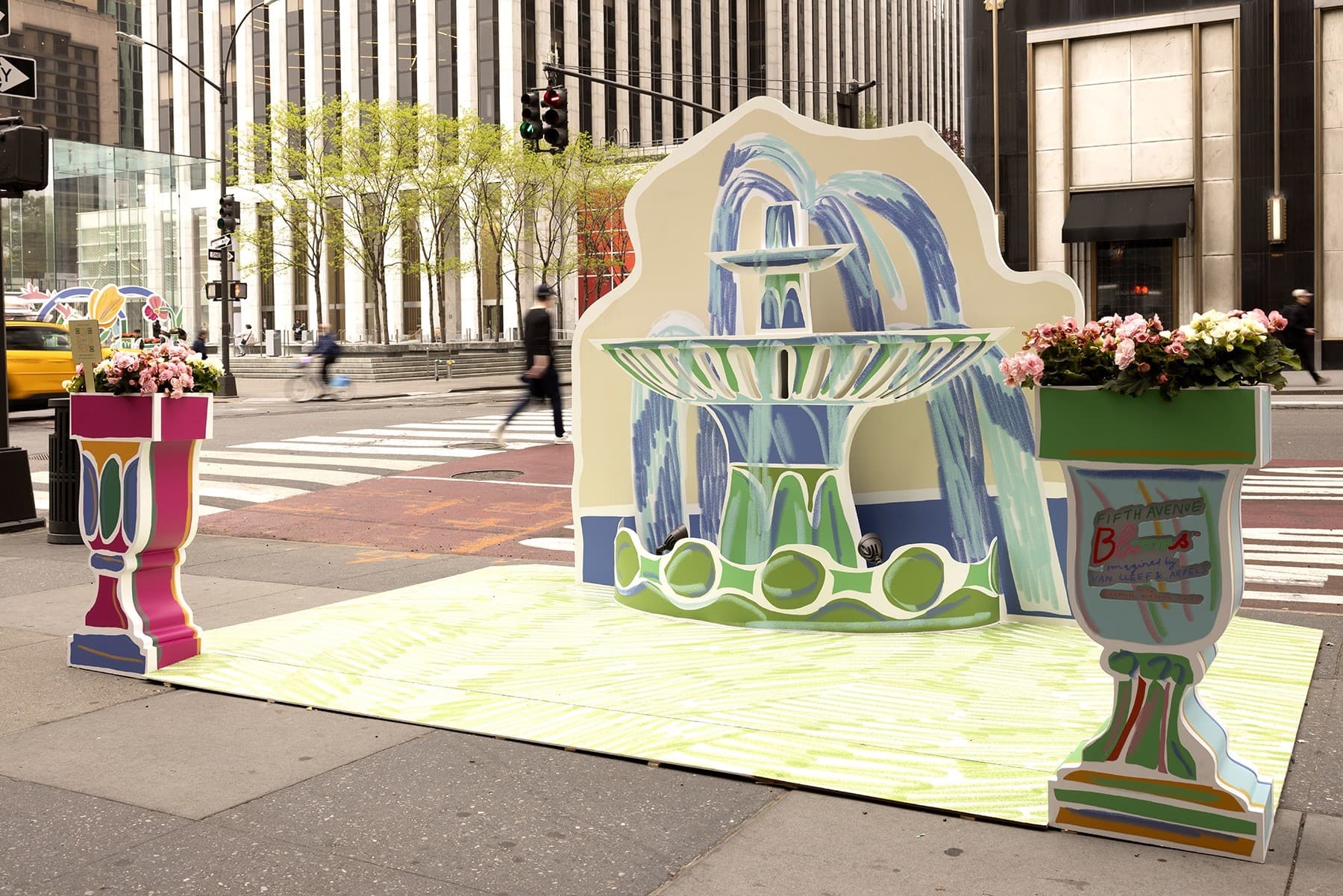 There’s something alluring about seeing French artist Alexandre Benjamin Navet’s playful renderings of daffodils and pansies set against the art deco facades of Fifth Avenue’s historic buildings. The contrast calls to attention the precision of every brushstroke and the curvature of each petal. The vibrant color palettes of the work offset the dreary hues of the sidewalks—yellow versus grey, pink against black.