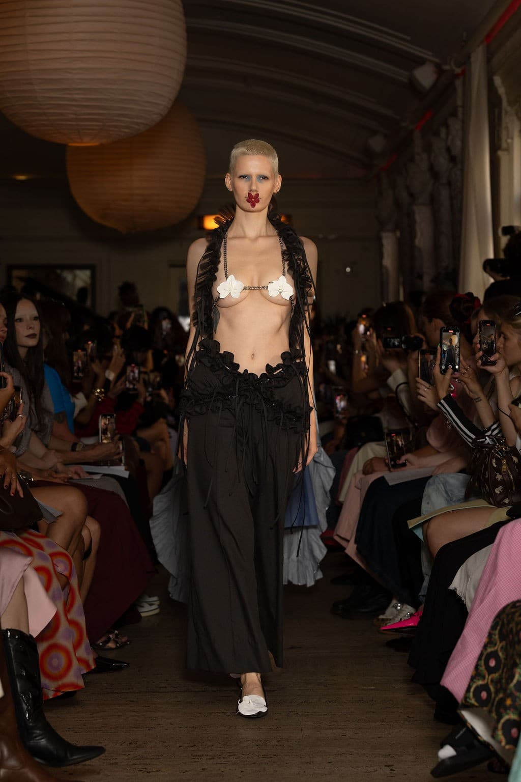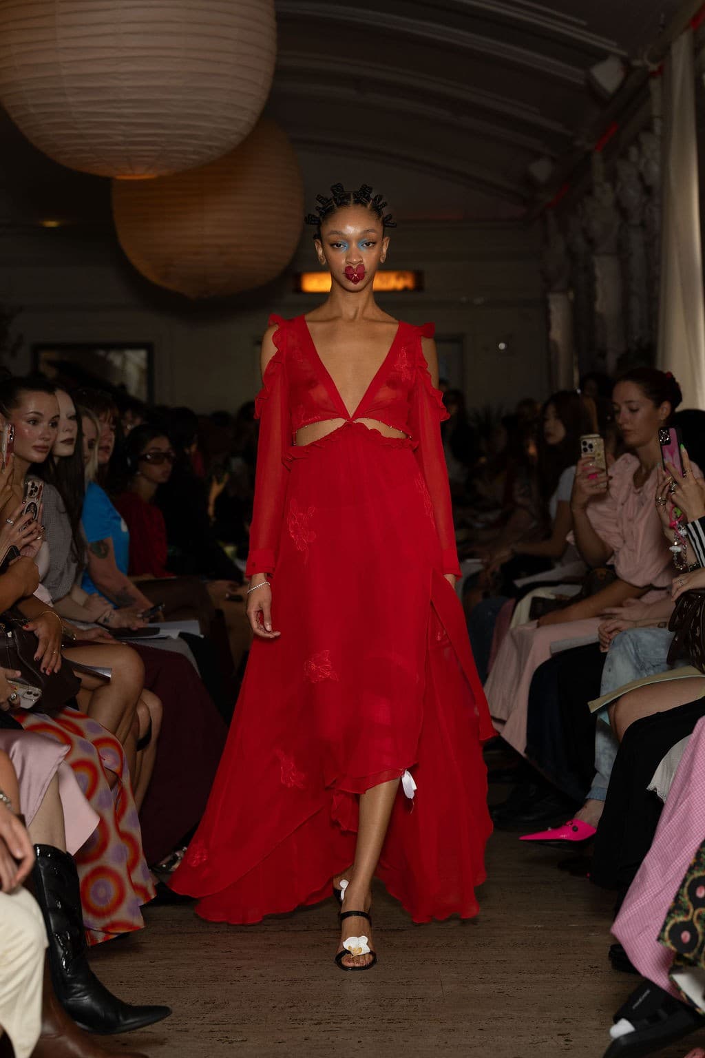 Karla TomanelliFor her Spring 2026 runway show, models walked down the runway to the sound of a live pianist at the Freehand Hotel with tiny red orchids placed on their mouth, a reference to another favorite film of Liu’s, Silence of the Lambs. Flower motifs were ever-present on a soft, silky blue cape, sheer, sexy black top, and more. Hair looked like whips from the back, tied up with a leather-like material. Clothing moved.