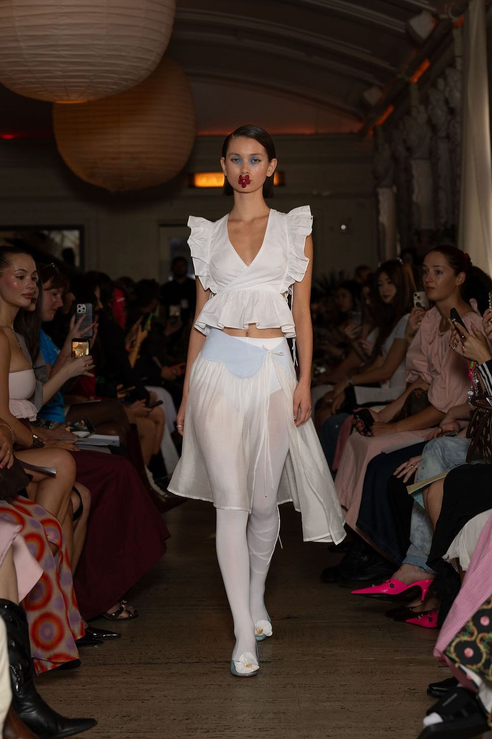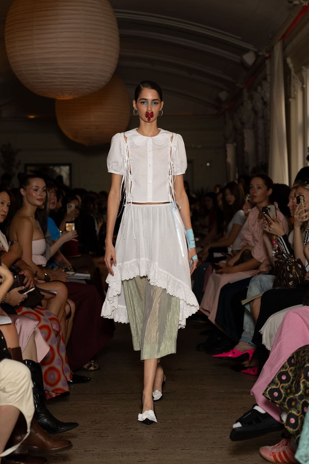 Her work carefully balances a dichotomous coin: On its underbelly side is horror, sex, and languishing lust—in film, in womanhood, in design—inspired by Ren Han, 17th-century Dutch portraiture, and Nobuyoshi Araki. But at face value, her work appears feminine, with girlish ruffles and bows galore. It's a point of frustration when her work is often compared to fellow designer Sandy Liang.