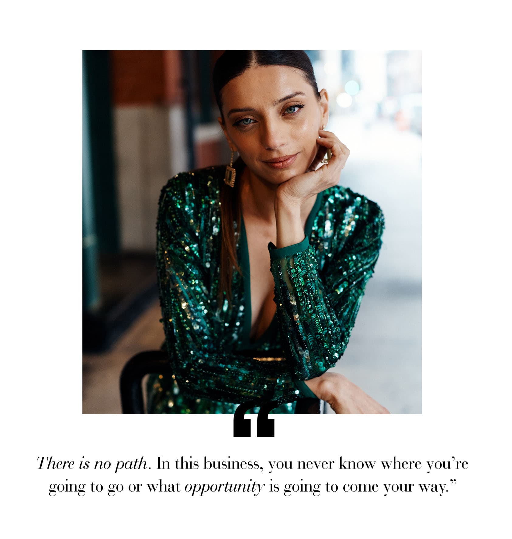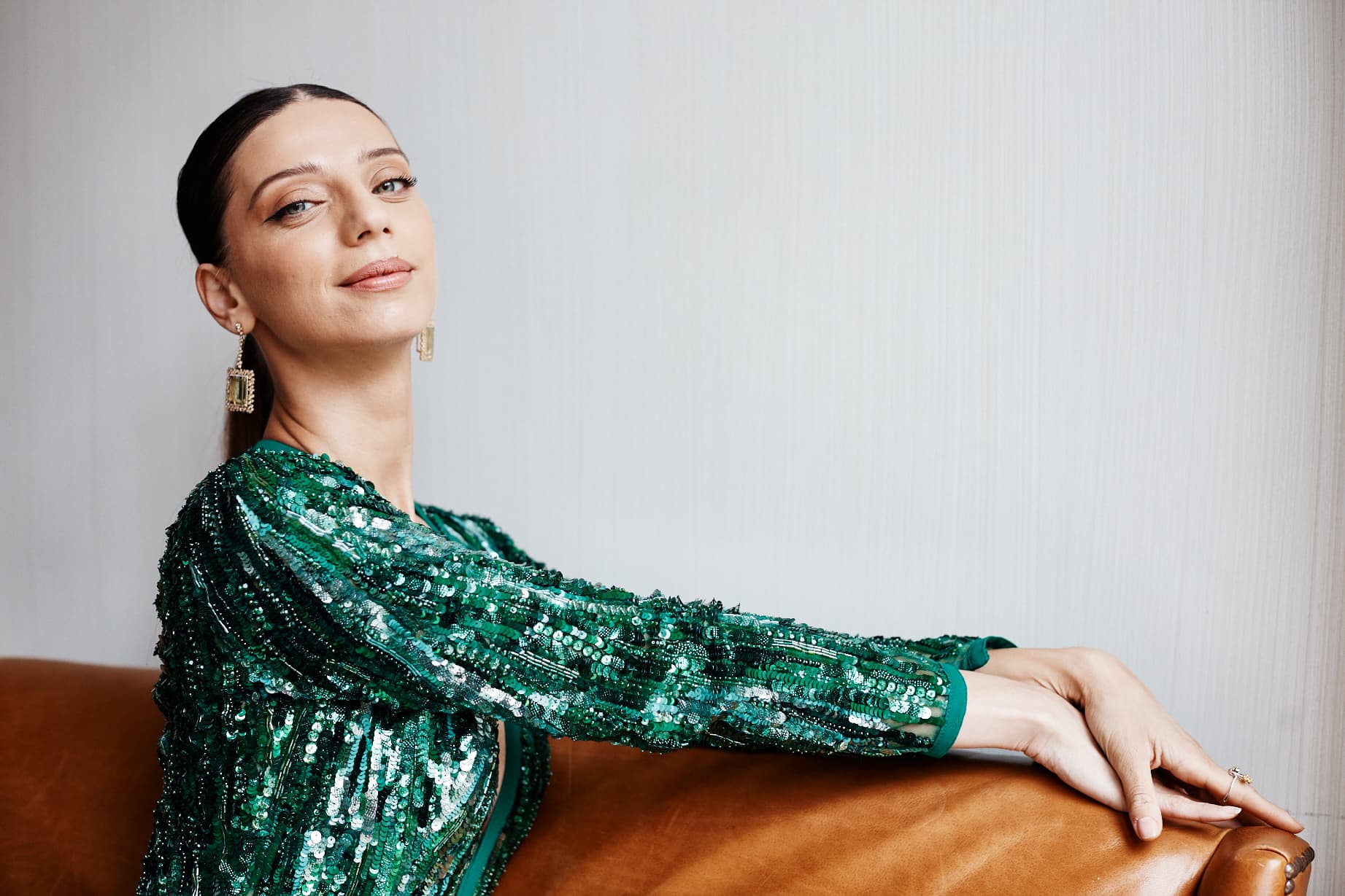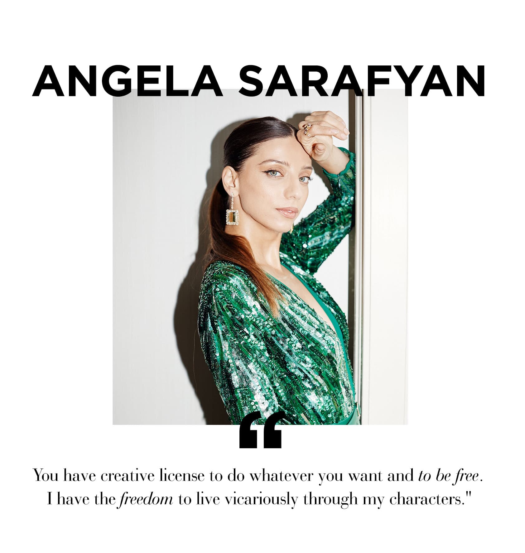 . Sure, her piercing beauty is hard to ignore (seriously, it’s hard to believe she’s mortal sometimes), but it’s her silent energy that magnetizes you, even if she isn’t center-stage. Off-screen, when we hung out in Sarafyan’s suite ahead of her