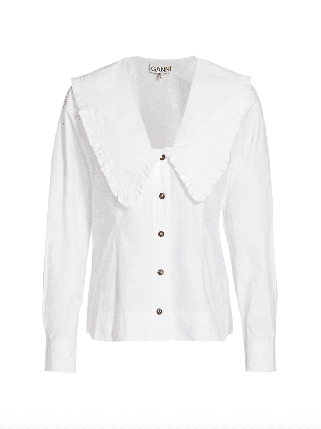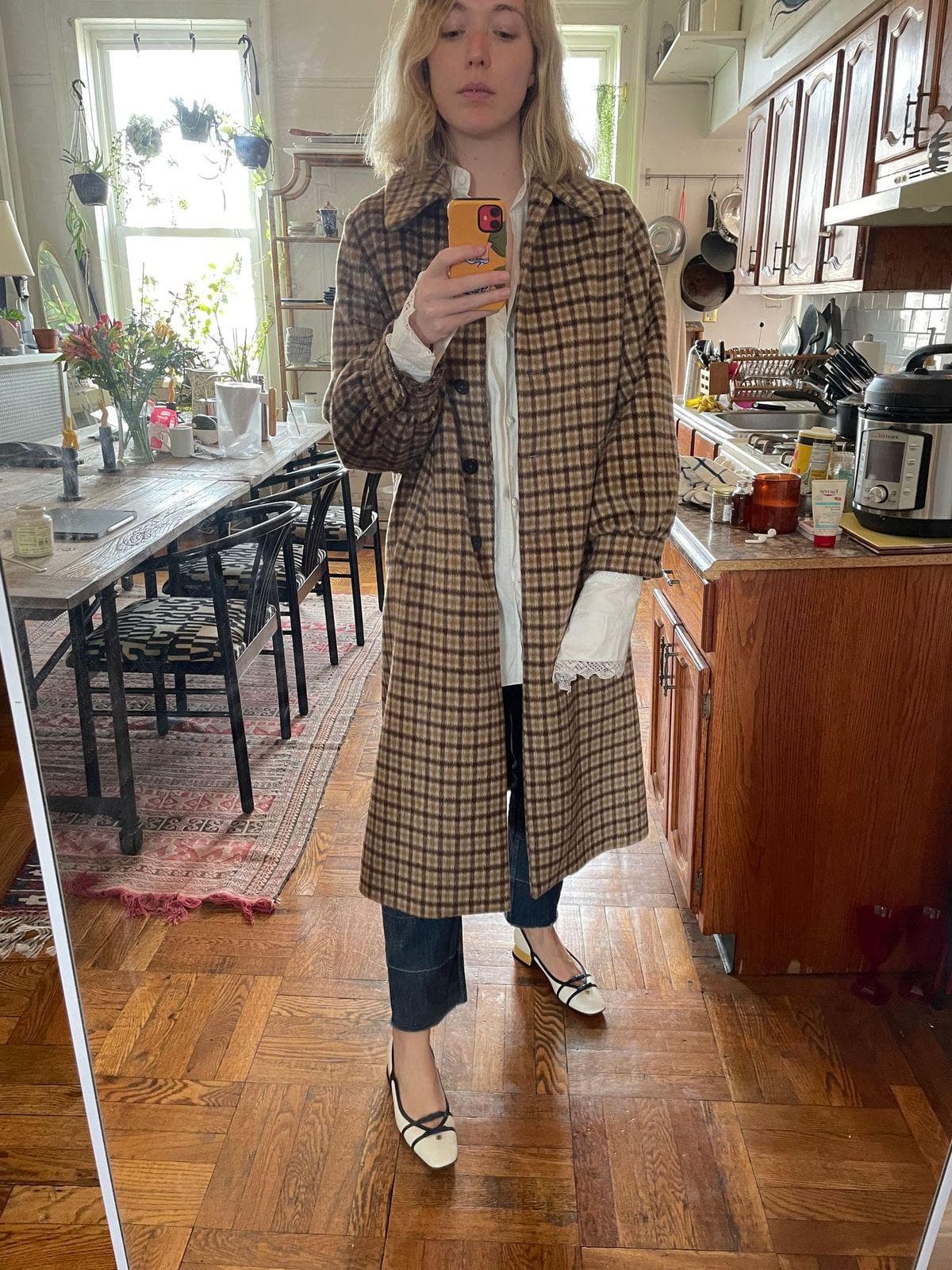 Photo: Courtesy of Angelica Hicks"This is a very simple outfit that basically works to show off the shirt. The shirt is made by the very talented sustainable artisanal couturier graduate from Central Saint Martin's, Larissa Von Planta. Everything she makes is 100 percent upcycled, and this shirt is made from old Austrian curtains! I love the cinching at the waist and the asymmetric sleeves—I love the fact that one is long. I like to wear it under this coat because it shows off the cuffs. The coat is also the perfect comfortable spring coat. I'm a big fan of the wool gingham as it makes the print appear blurred. It's a simple look that makes me feel good."